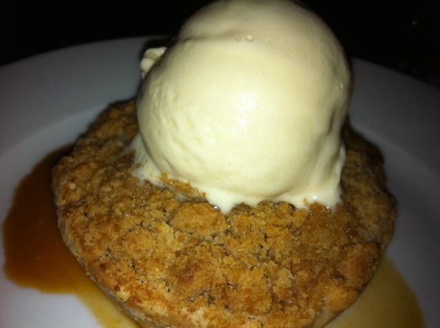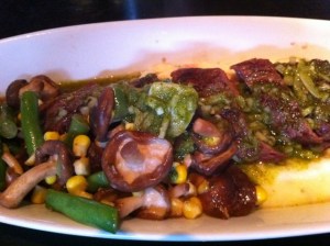 We considered the low country boil for our main course, but with that roaring fire a few feet away from our comfortable booth, we decided that we needed something cooked on that grill. We went for the bistro steak, a 10 oz. hunk of meat with whipped potatoes, and a bean, corn and shitake mushroom side of veggies. They cooked that steak to perfection, and like the salmon chips, it did not last long.