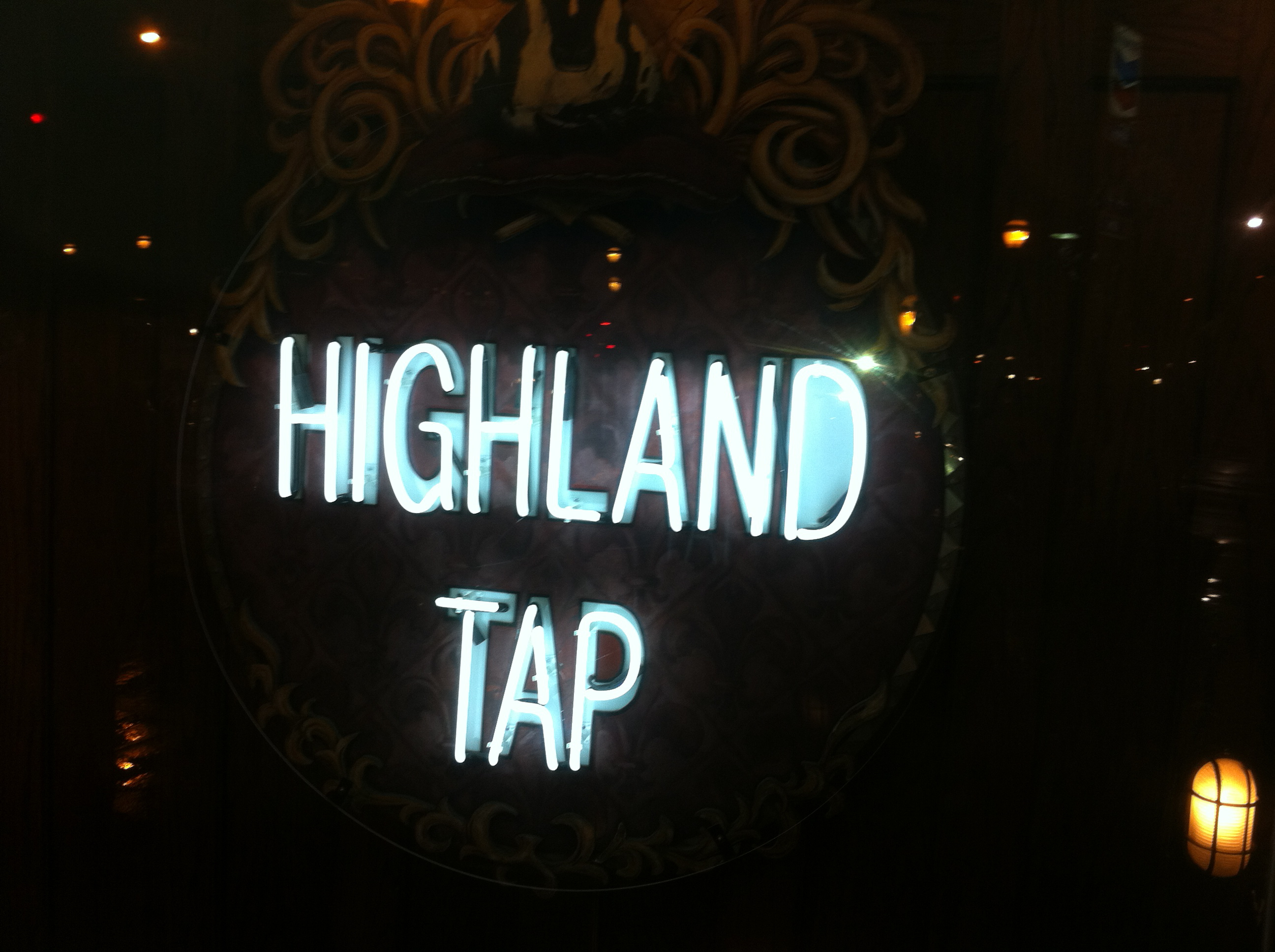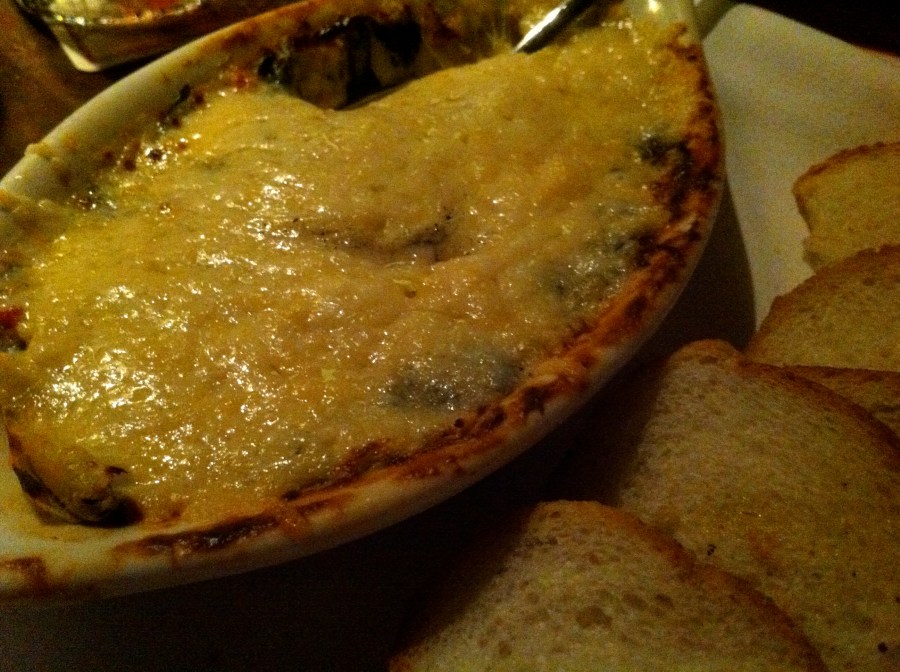 For drinks and appetizers we pop into the Highland Tap right across the street. Highland Tap has been around since 1989, but we have never been here. The place is actually underground and we walk down a long flight of stairs to the bar, which is enclosed in the brick and stone of the building’s foundation. They claim to have the city’s best burger (a claim we have seen in other places–wouldn’t it be fun to go to all of them and figure out where the best burger really is?), but we don’t want to fill up, so we order a spinach and artichoke cheese dip. It comes with a generous supply of crunchy crostini. It’s very cheesy, and we don’t taste much spinach or artichoke, but it’s really good on the crostini, as most things are.