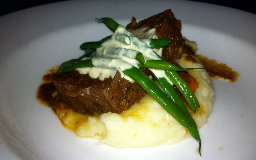 We go right for the entree, and decide to split the Guinness braised beef brisket, which comes with horseradish mashed potatoes, roasted carrots, and green beans. To make sure we have enough to eat, we also get a side order of their truffle mac ‘n cheese.