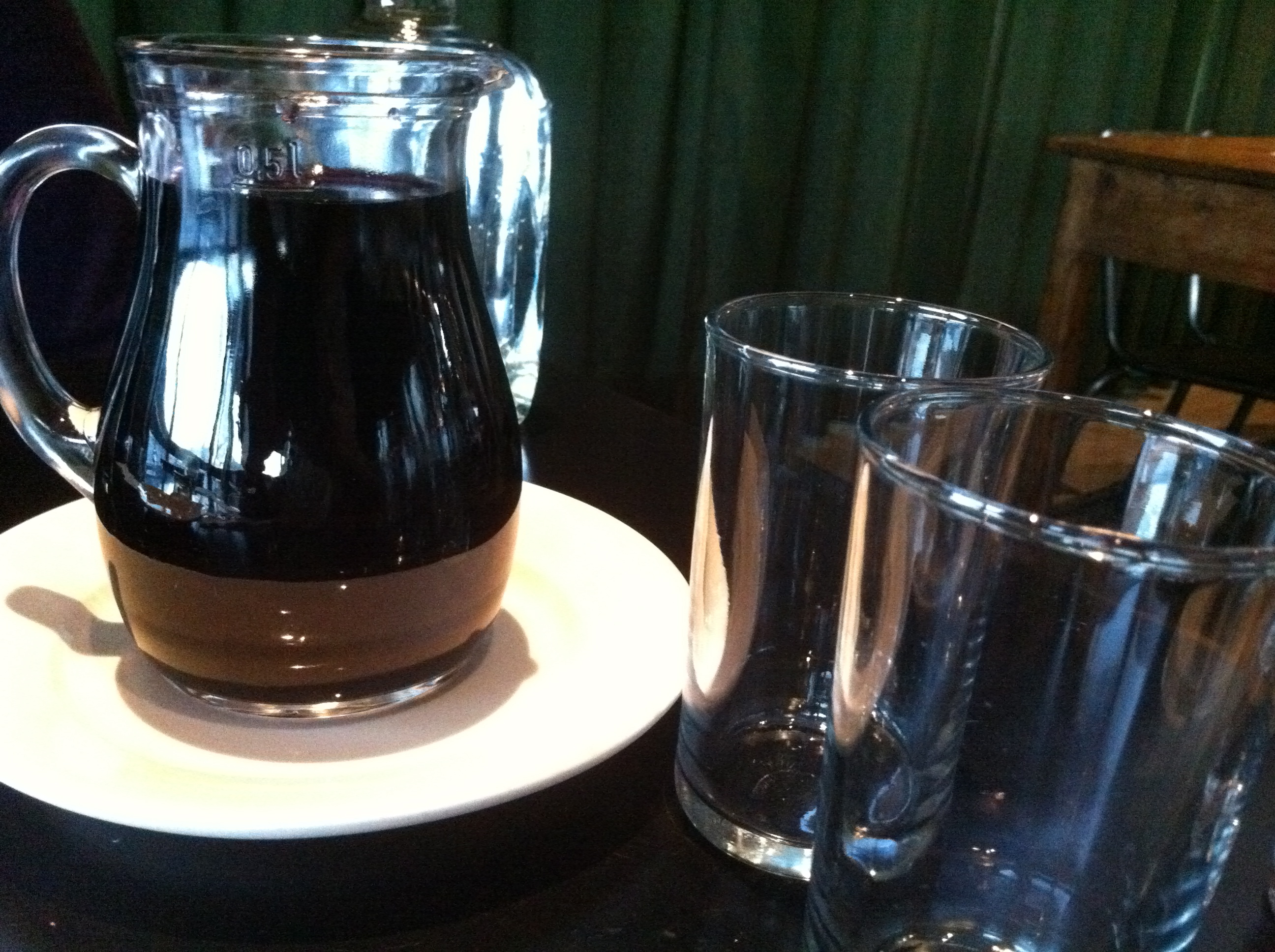 Our next course is dessert, and with our deal we get a boozy milkshake, not something we would normally order since we just shared a carafe of wine, but when at West Egg…Our wait person tells us that chocolate bourbon is their most popular shake. Although the coconut rum sounds intriguing, we go with the chocolate.