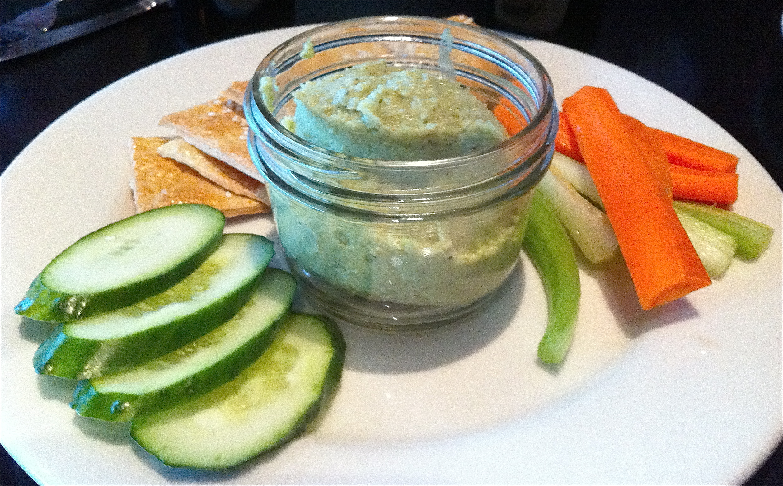 The hummus comes in a mason jar and is served with light and yummy crackers and vegetables. Its delicious and we are eager to take the edge off our our hunger so we dig in.