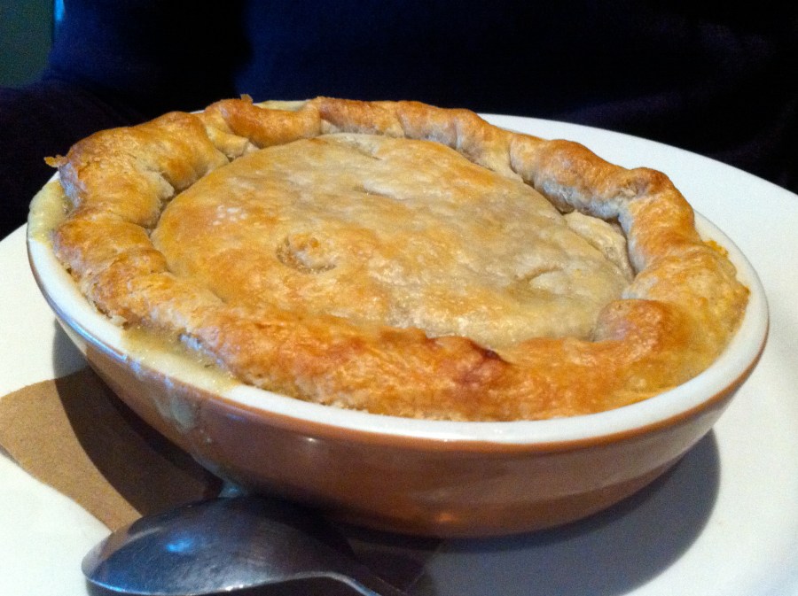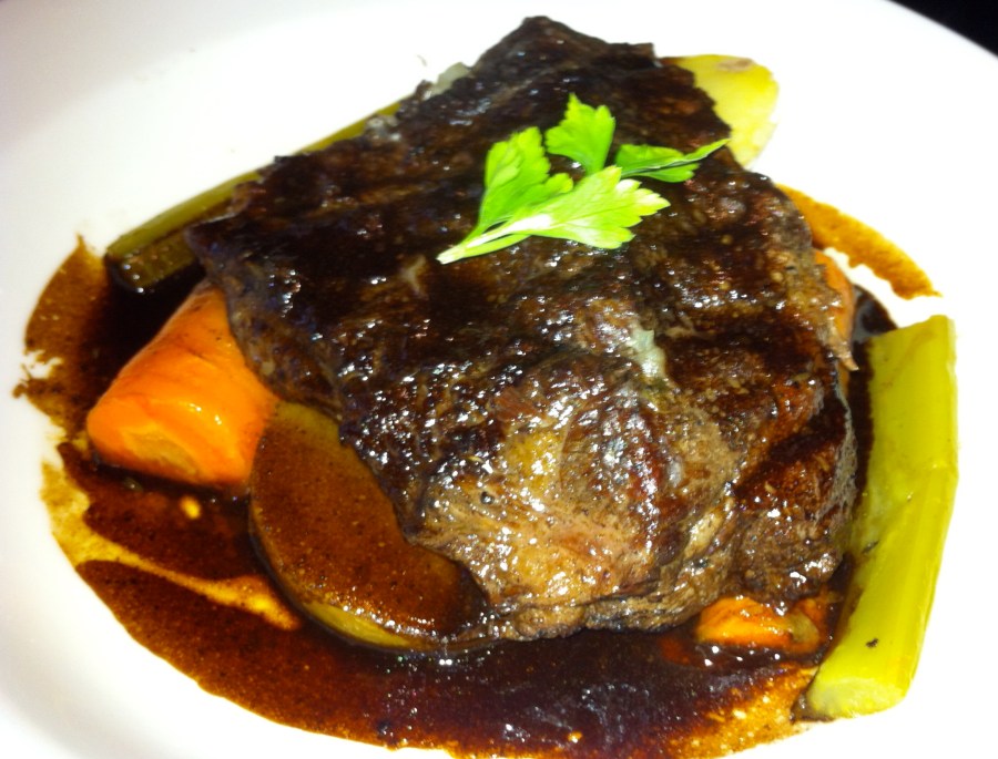 The short ribs are tender and flavorful, as they should be. The pot pie crust in flaky and perfect, the broth is a delicious soup – served with a spoon – and it really compliments the tender chicken and dumplings.