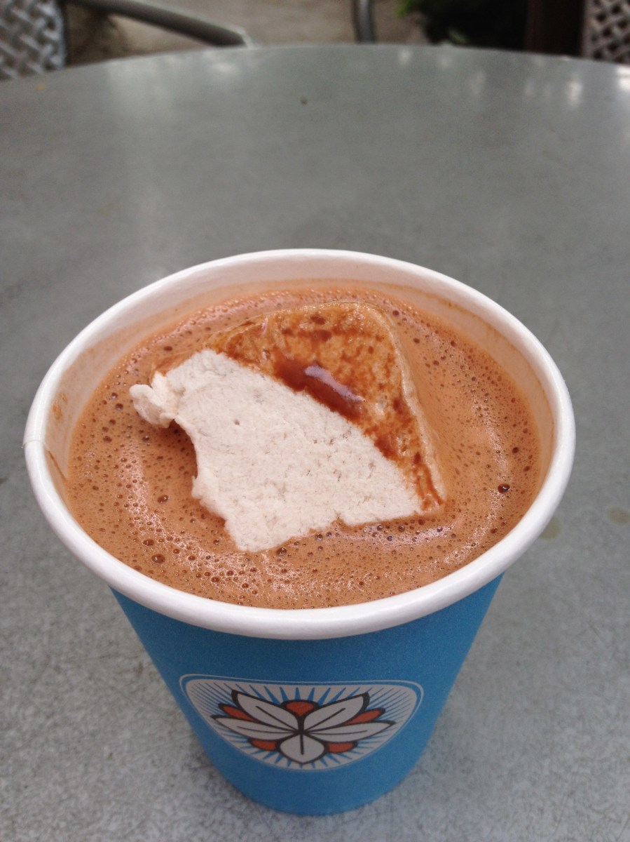 This warrants a full investigation, at the very least we need to know how late they are open so we can make dessert plans! The Cacao Laboratoire closes at 6. We are drooling over “in store made” “bean to bar” confections. The entire place is filled with the sweet aroma of fresh chocolate. (As an aside, we visited Hershey, PA this past summer and nothing there smelled like chocolate!) Amazing truffles and holiday specific treats seem to be the specialty (there are artisan Easter bunnies and eggs available). What would you do? Its 4pm, and we have dessert! We order a hot chocolate, which comes with a house-made marshmallow.
