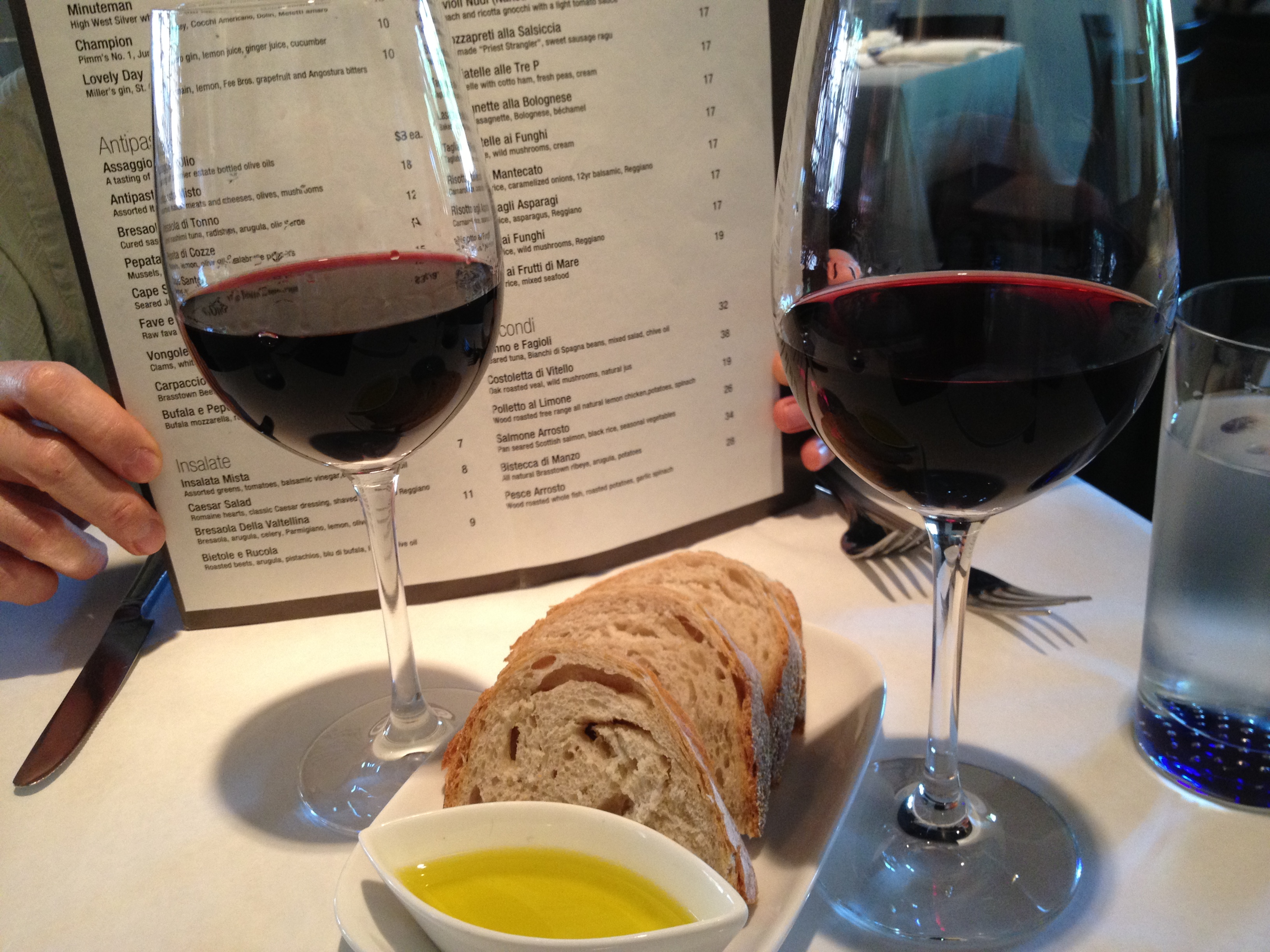 “Sotto squared” is Italian food, featuring pastas and wood-grilled meats from their wood-fired oven. Next door is Fritti, the more casual of the two, which has pizza and sandwiches. We start with some big Italian wines, a Chianti Classico and a Super Tuscan.