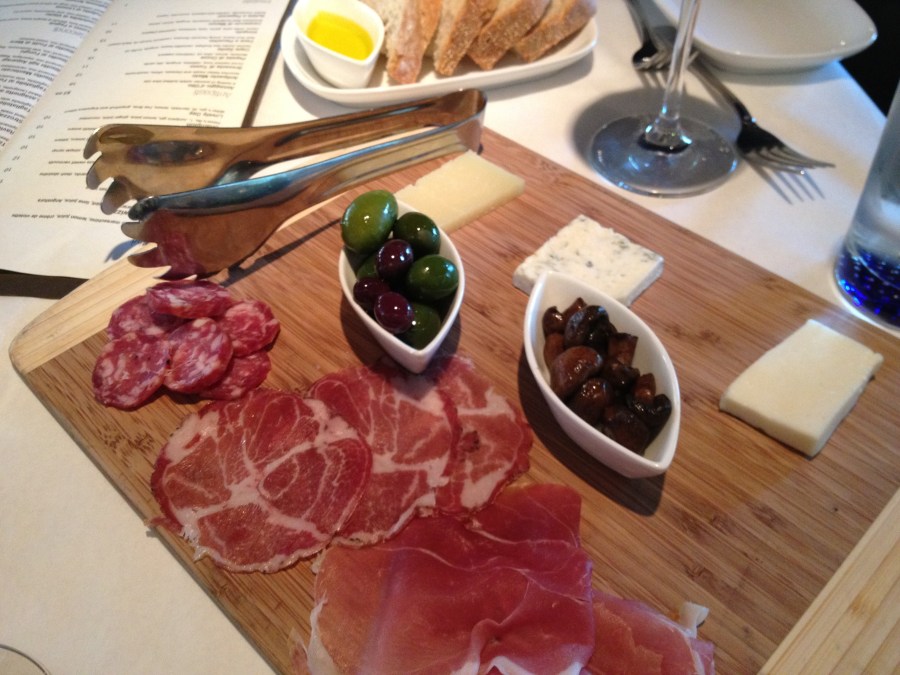 The plate comes with three meats and three cheeses. We get nice slices of pecorino, Gorgonzola and taleggio on the cheese side. The meats are boar sausage, prosciutto, and capicola salami. There are also olives and mushrooms on the platter. The pecorino and boar sausage are the favorites on this plate, but everything tastes wonderful.