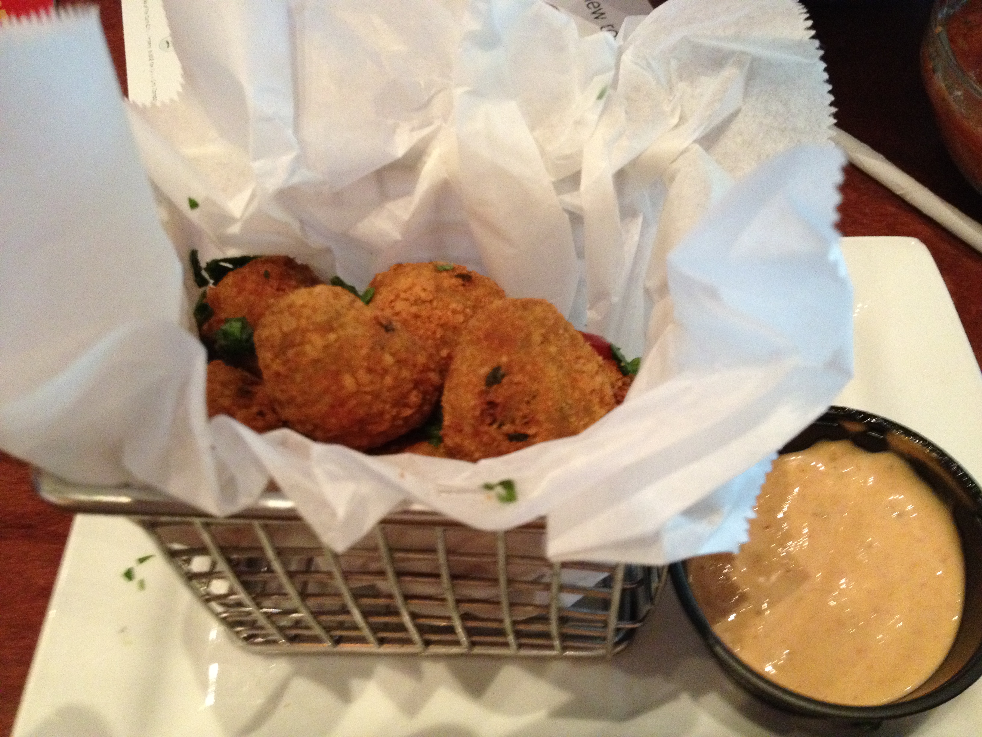 There are many enticing choices for appetizers and entrees. We are all hungry, so we put in an order for guacamole hush puppies. They come out fast, and are exactly what you would expect them to be. Crunchy on the outside and soft tasty guacamole on the inside!