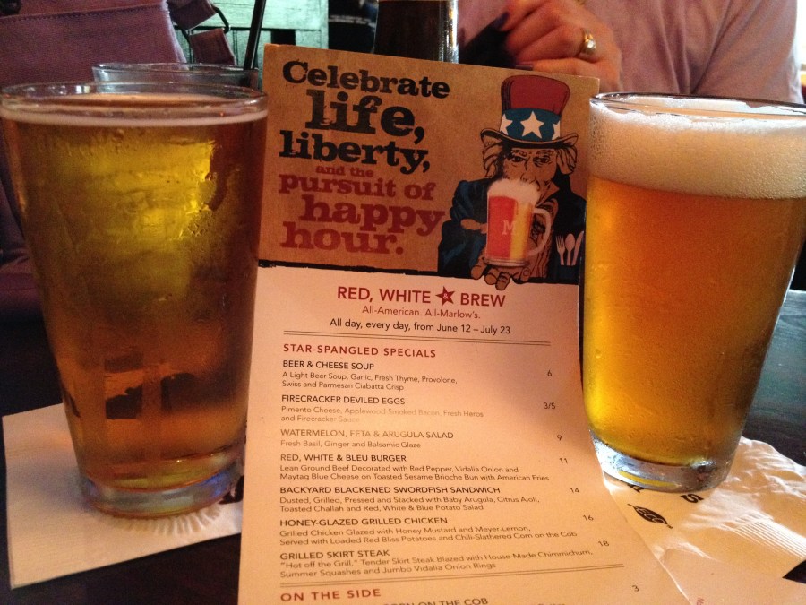 As we were sitting around Date Night headquarters discussing the location for tonight’s date, I happened to spy a $10 off coupon in the newspaper for Marlow’s Tavern. There is a Marlow’s about 2 miles from HQ, and we don’t usually need an excuse to pop into an East Cobb favorite. Tree huggers that we are, we decide to walk to dinner, and because it’s the hottest night of the year (90 degrees plus when we left), we are “glistening” by the time we reach our dinner destination.
