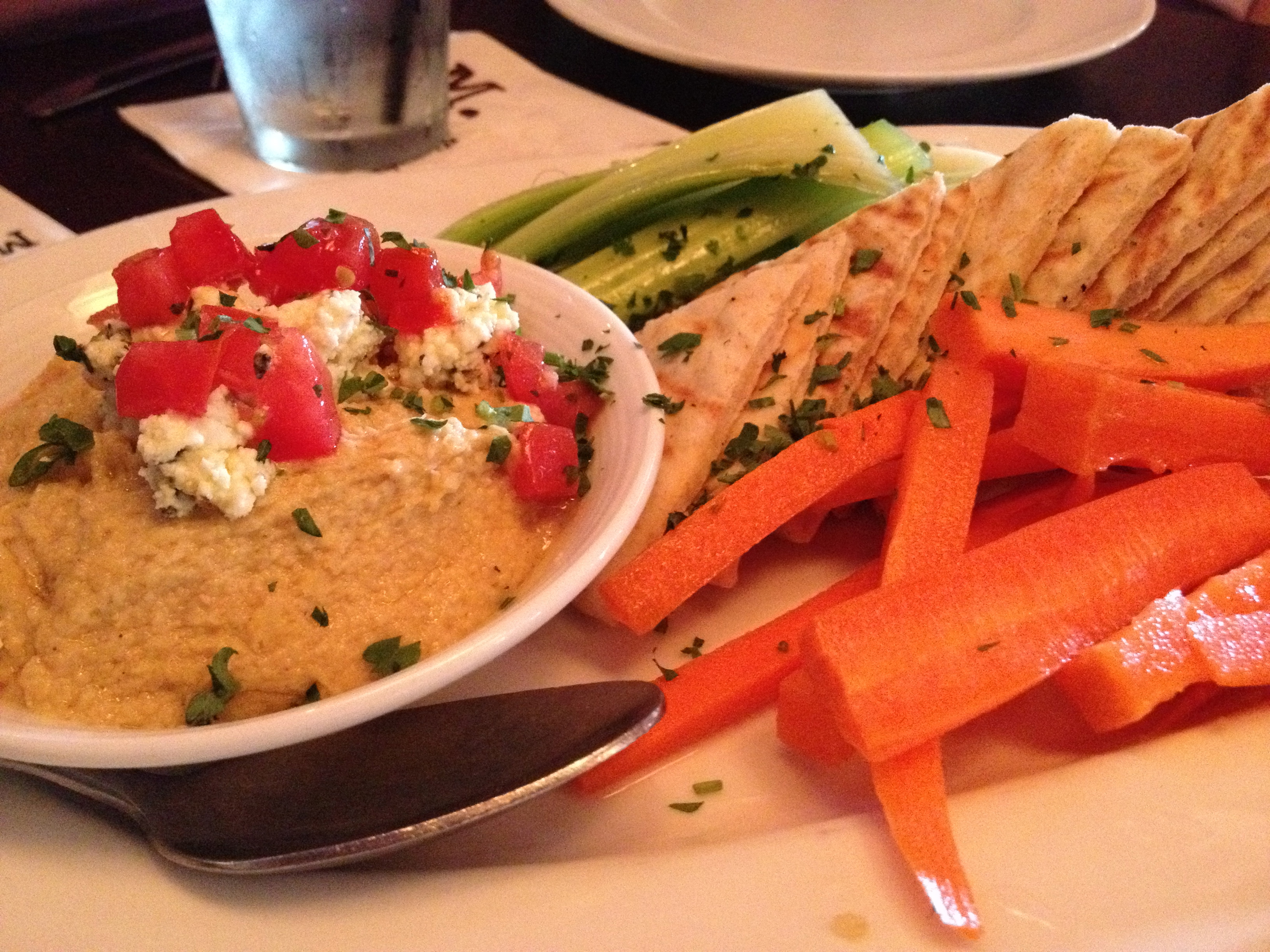 There is a lot of hummus on this plate, and the pita points are warm and soft. It’s important to eat your veggies, so we ate all of the carrot and celery sticks. I’m a celery guy, and Eve is a carrots girl, so there was plenty for both of us.