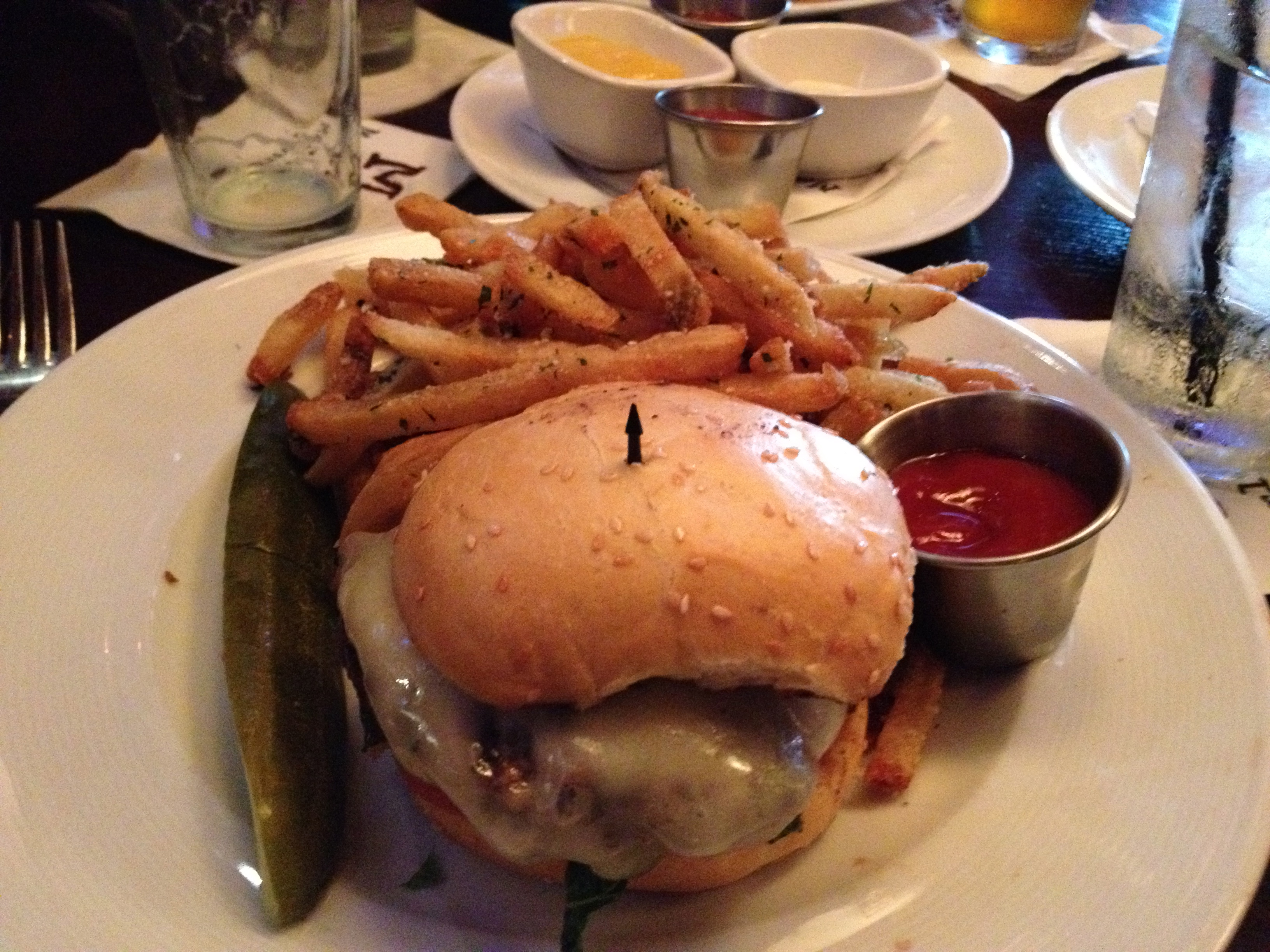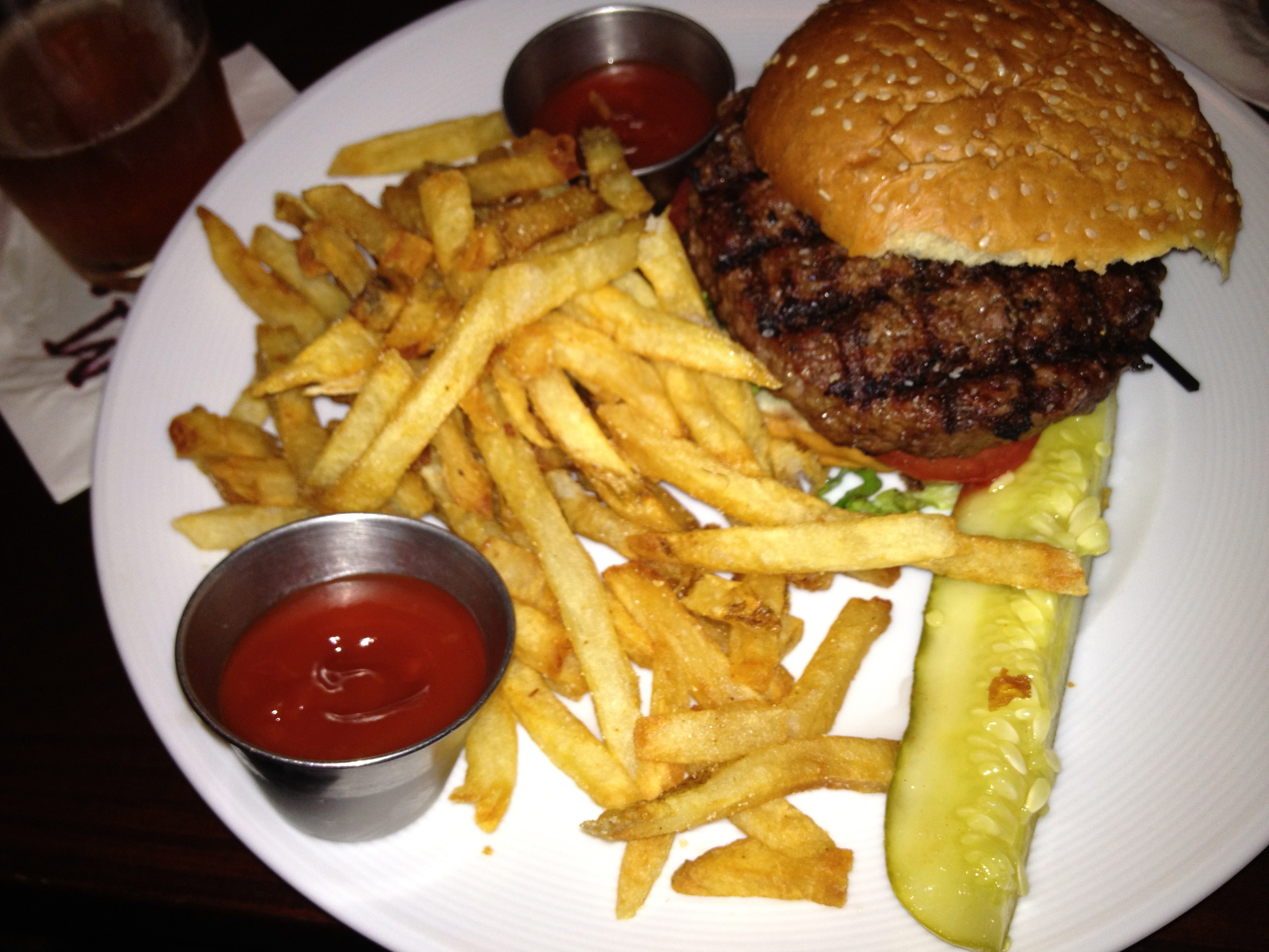 Marlow’s has really good burgers. The best in the city? Probably not, but we have never had a bad burger here. The big question at the table is to split one (lots of hummus in our tummies) or to each order our own. We both get our own. I order the cheeseburger with parmesan fries, which our server points out are $1.25. Yes, I am worth it.