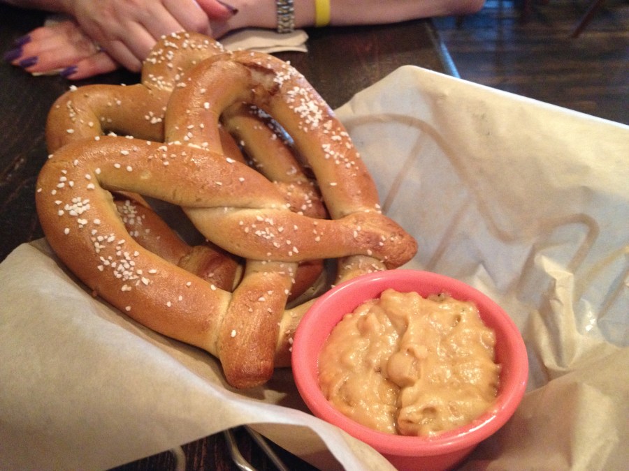 Roger, still celebrating the rare blue moon we had last month, orders a Blue Moon, a reliably good beer (albeit mass produced as well) if your choices are somewhat limited. The best part about the Roswell tap experience is the order of Guinness baked pretzels with Irish cheese dip.