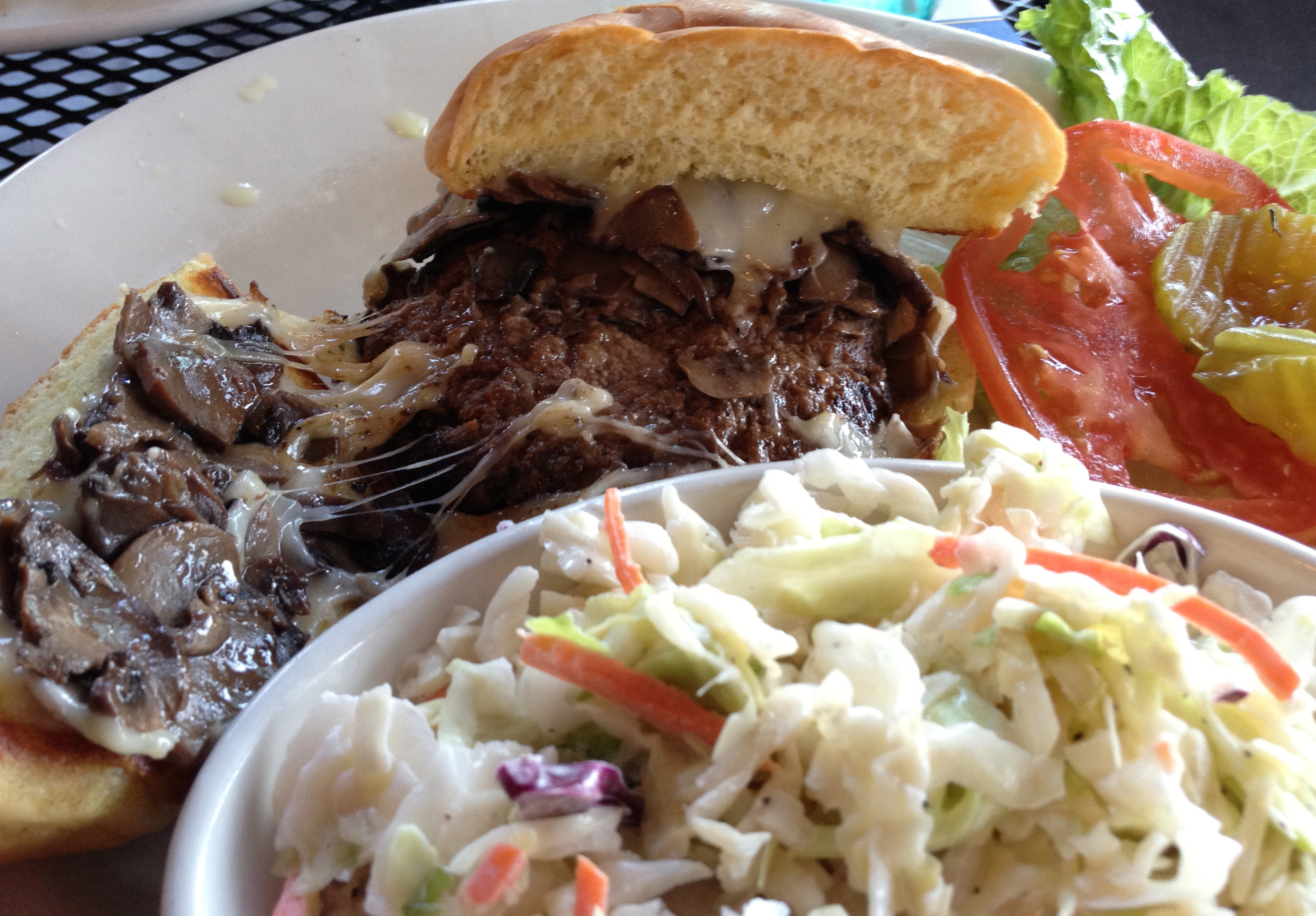 The burgers are served on a challah roll with lettuce, tomato and pickles and you pick french fries or coleslaw as your side. The server doesn’t ask how we want the burgers prepared, and we get the standard “medium-well”.