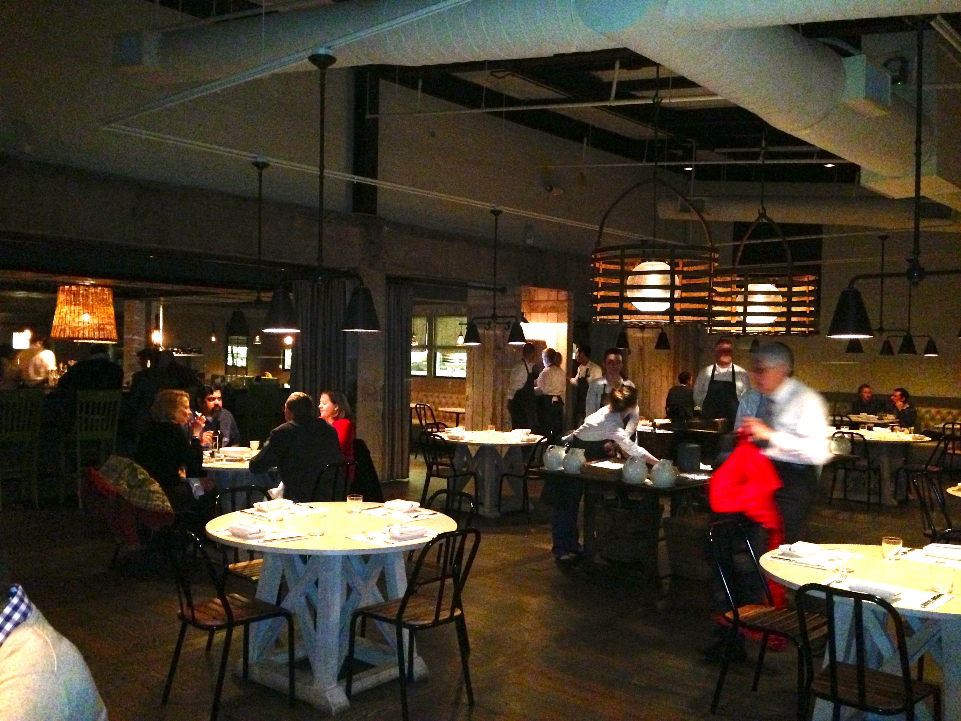 The dining room is open, with high ceilings. There is a big bar on one end and an outdoor dining area that is closed on this cold winter night.