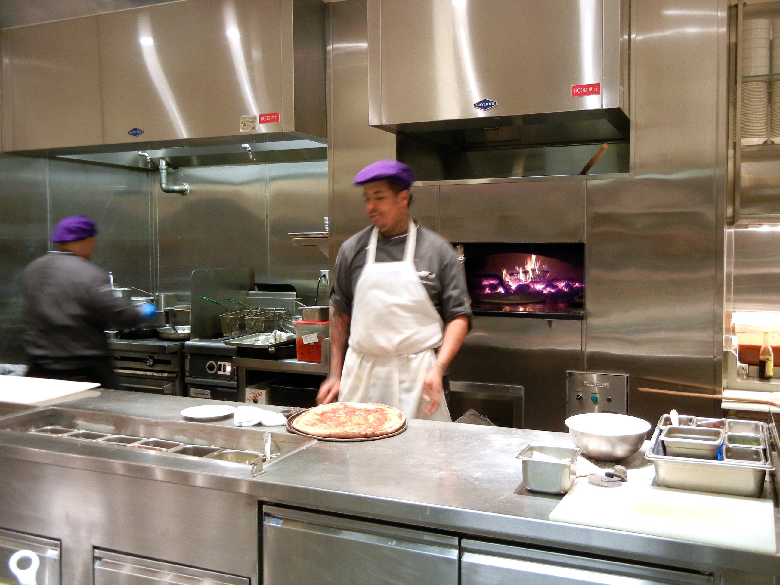 The giant meatball is good, as is the “pizza of the day”, which the chef, interacting with us in the interactive kitchen, proudly told us was his invention, artichokes and sun-dried tomato. Fortunately, I was able to split this with Eve, so that we would have room for dessert.