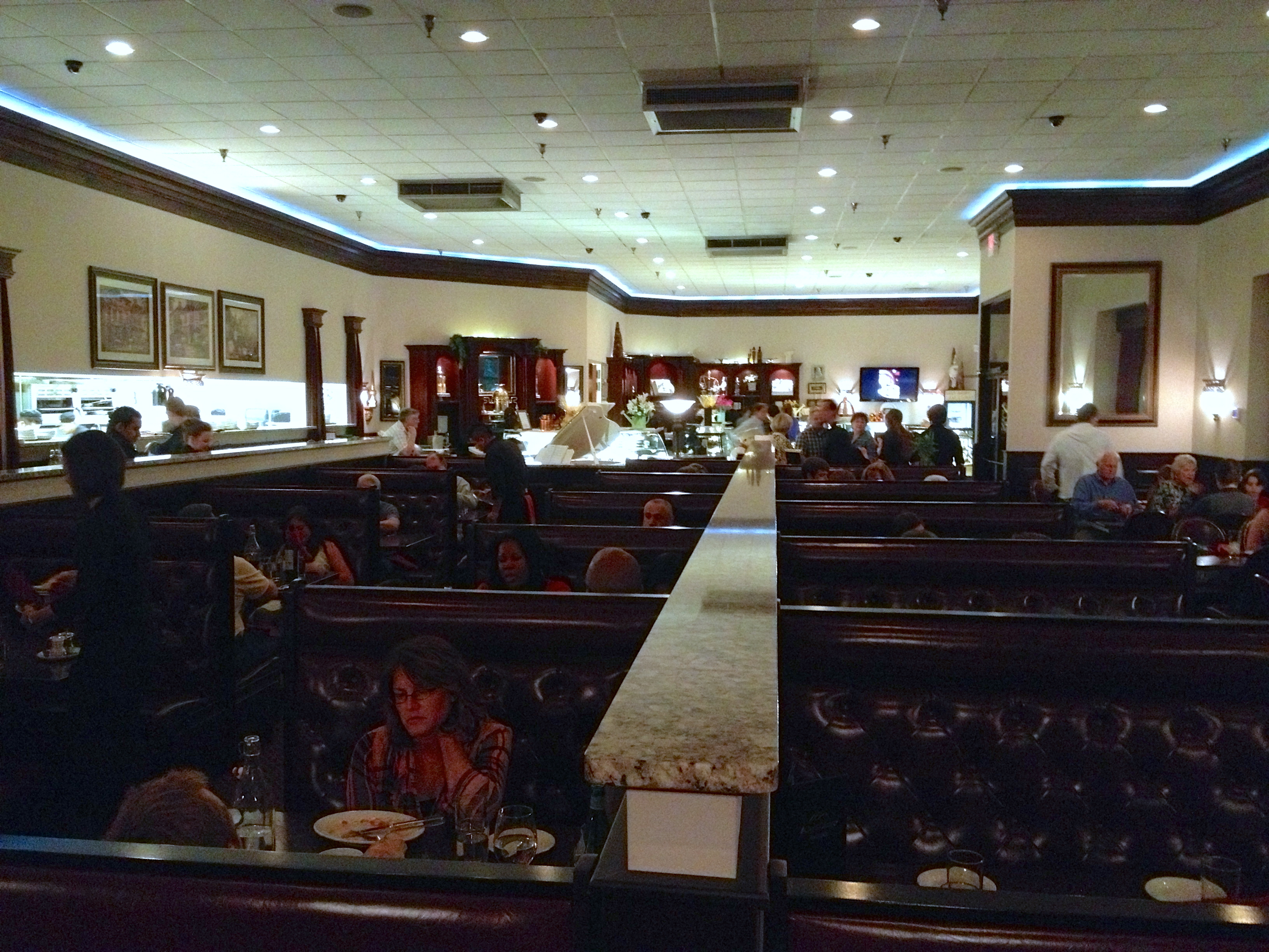 Inside, there is a lot of dark wood and marble in the decor. There are burgundy red booths as well as many tables for large parties. We see a full table of 10 and a table of 12, so the families obviously like the food.