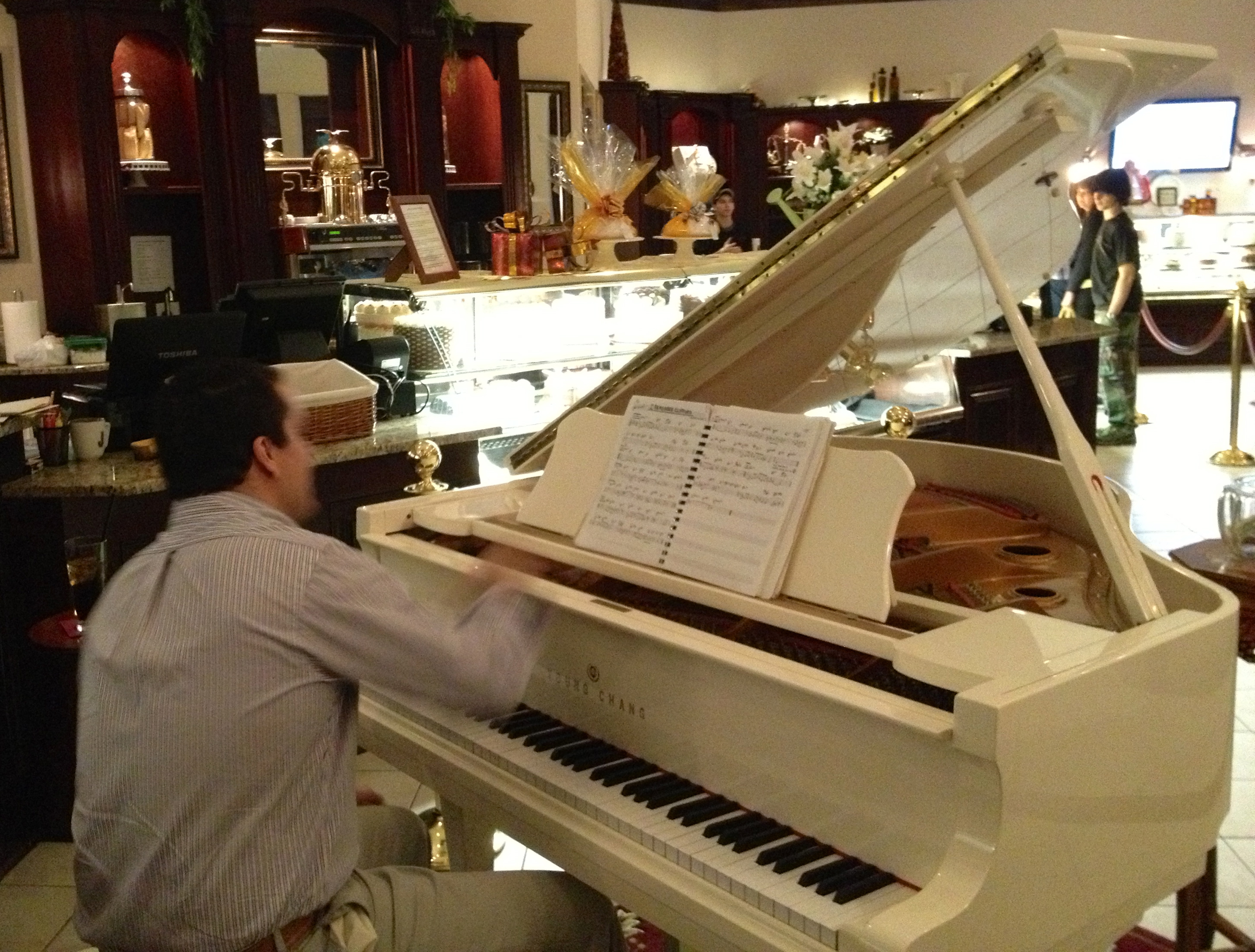 There is live piano music tonight, and in honor of the upcoming HBO Liberace movie with Michael Douglas and Matt Damon, we insert a picture of our piano player and his extravagant white piano.