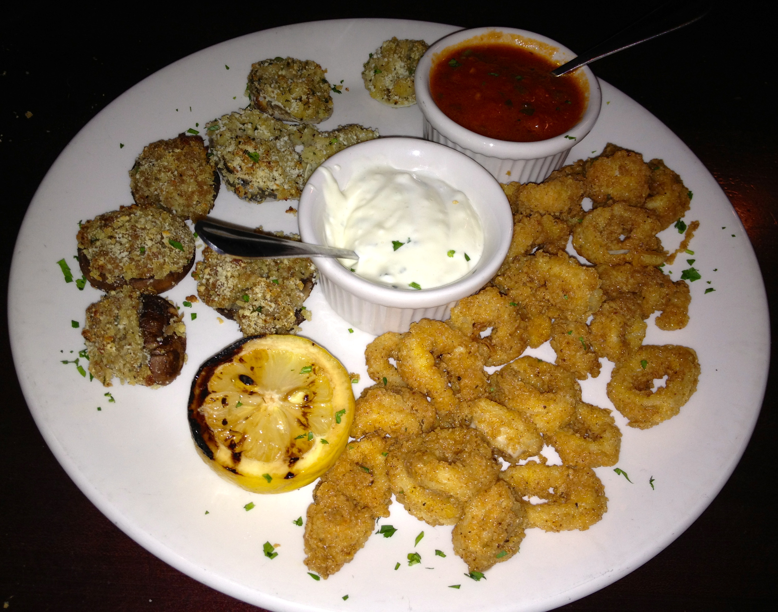 We have hit the trifecta. Stuffed mushrooms have sausage in them and pack a little kick from the spicy meat. The clams are stuffed with butter and bread crumbs. And the calamari is crispy on the outside and chewy on the inside. There’s marinara and ranch sauces for dipping.