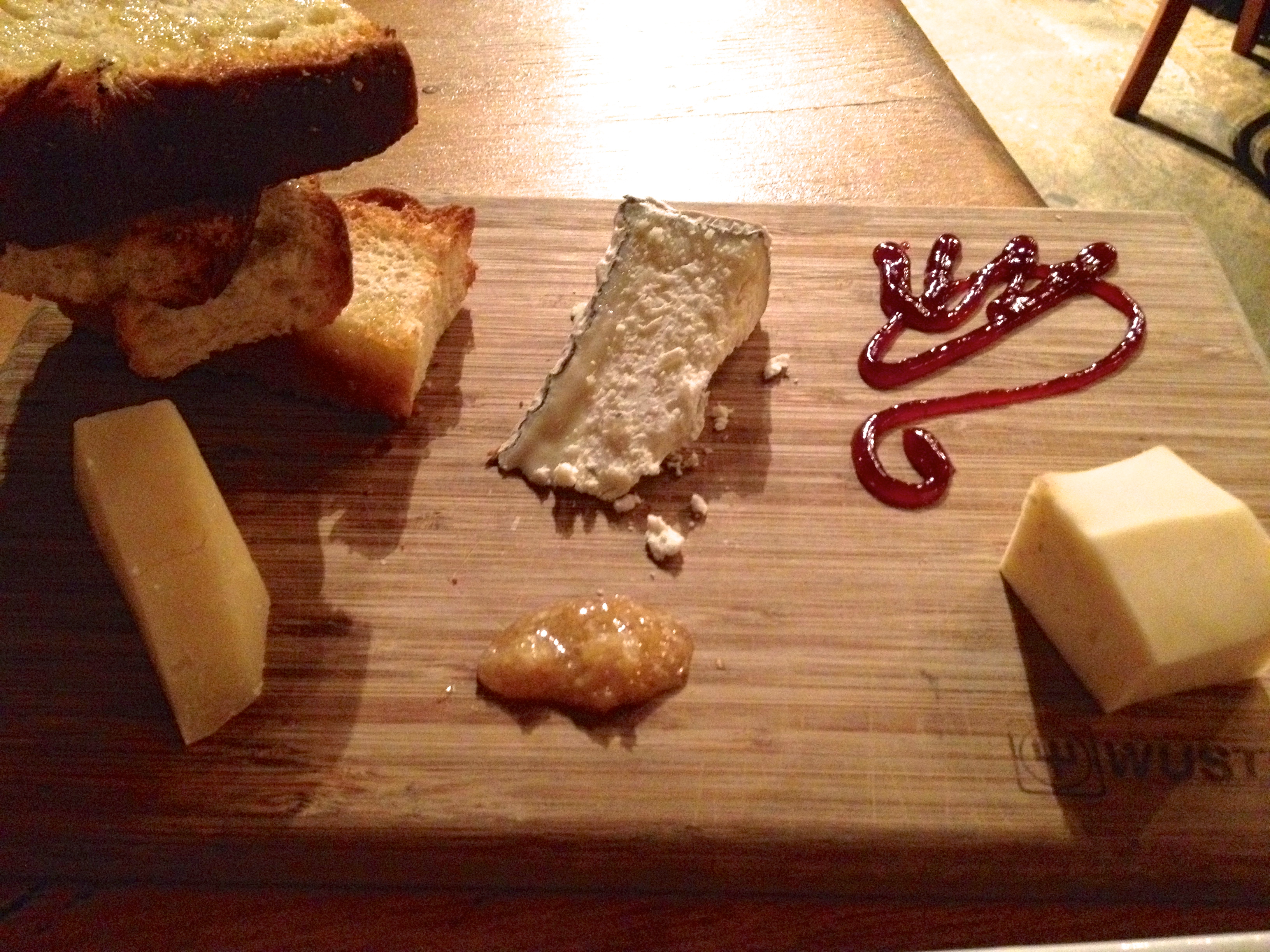 We share the cheese plate as well. This one has Pecorino, Humboldt Fog, and Tellegio cheeses on the platter. Raspberry jam and honey complete the plate. The bread on the cheese board is different from our earlier bread. This one is more like cake than bread and the sweetness offsets the rustic taste of the goat, cow and sheep cheeses.