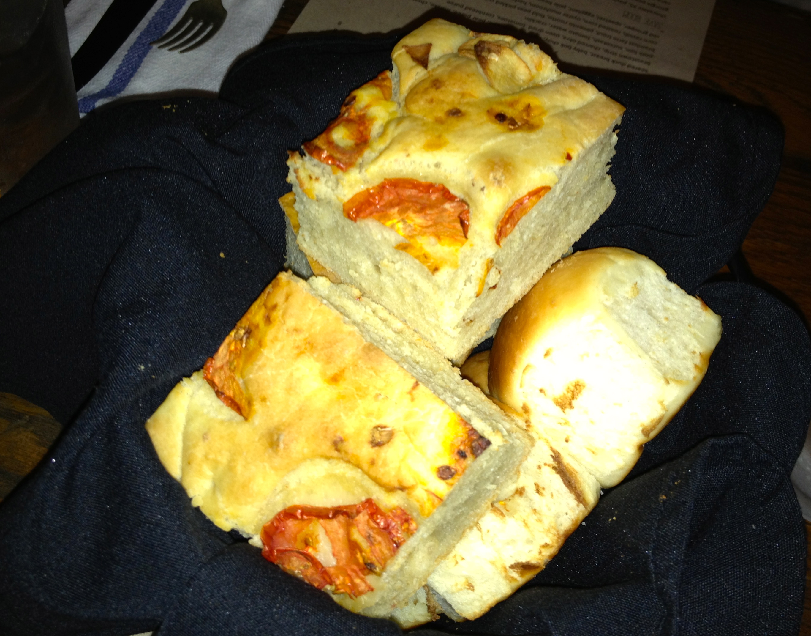 Tomato-garlic focaccia and buttery dinner rolls begin the feast. The focaccia does not last long at this table. There is a refrigeration problem tonight and none of the beer taps work, so we must order bottles or cans from the nice list of 18 choices.