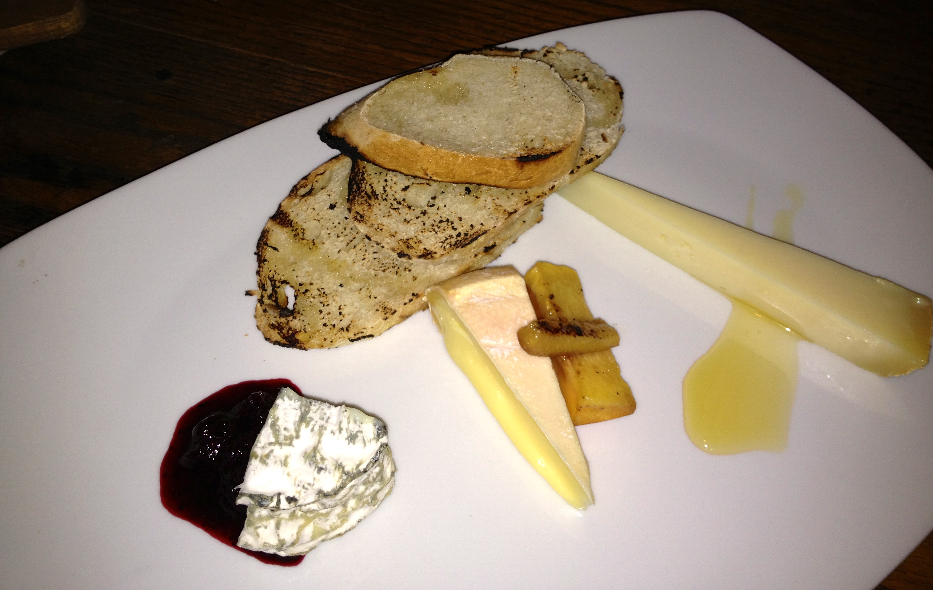 The cheese plate features a goat cheese and two cow cheeses. There’s some honey, a pickled peach and some blueberry jam to counteract the strong cheeses. It’s good, but we also need to order something cooked from the appetizer menu.