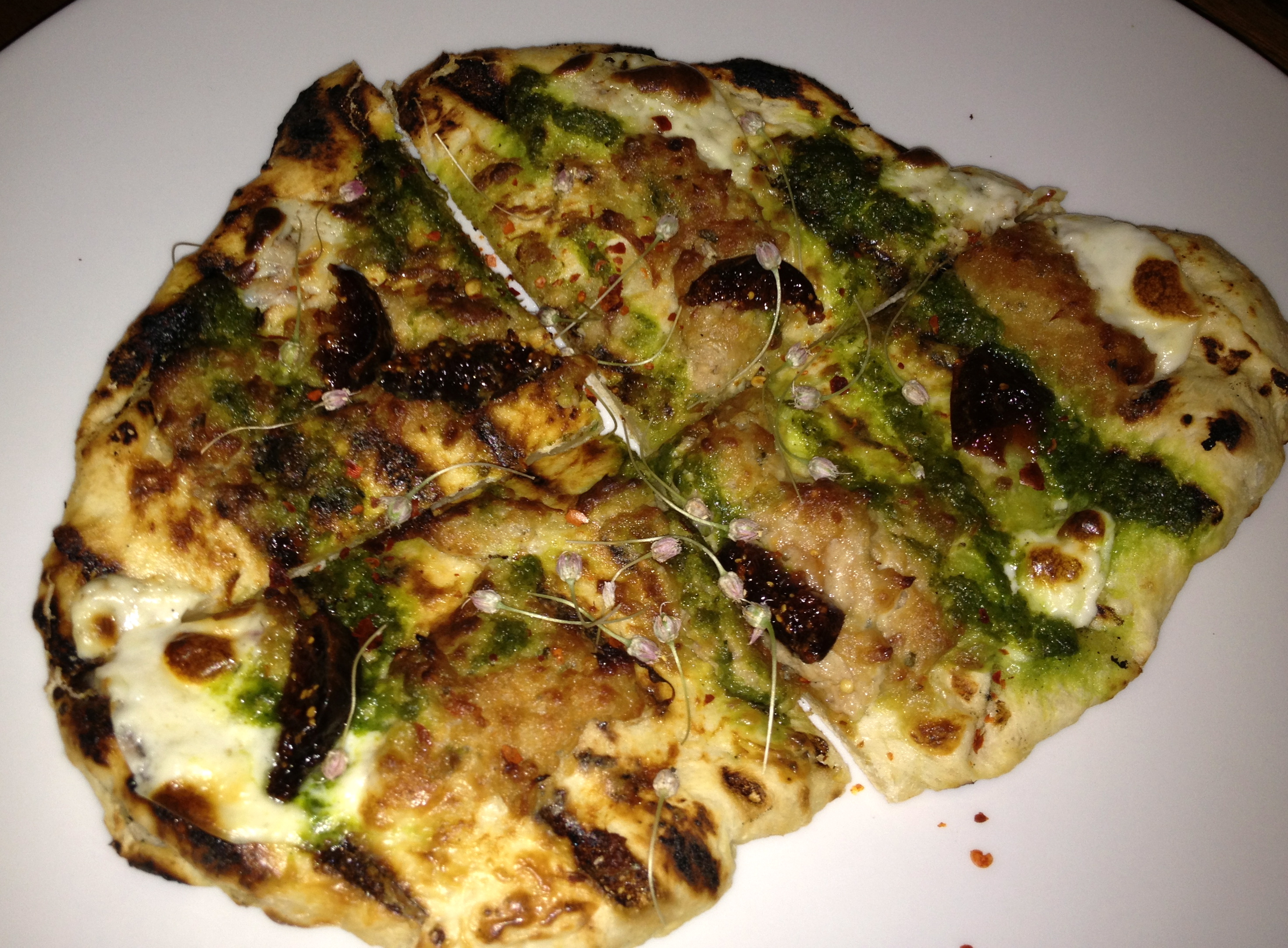 They call this flatbread the “Pig and Fig”. It’s got pork sausage and roasted figs along with pesto and marscapone. This is an interesting dish. The pork is a bit spicy and that is offset by the sweetness of the fig and the parsley in the pesto.