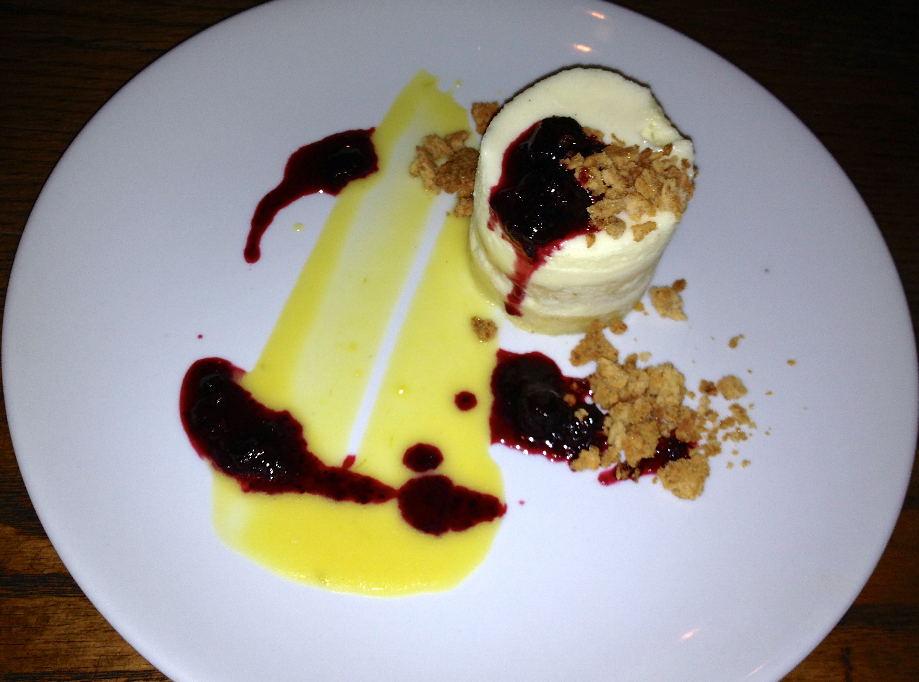 We get two desserts for the table. The first is an almond frangipani with blueberry compote, key lime curd, brandy snap and creme cheese. The Baker does a great job on this one.