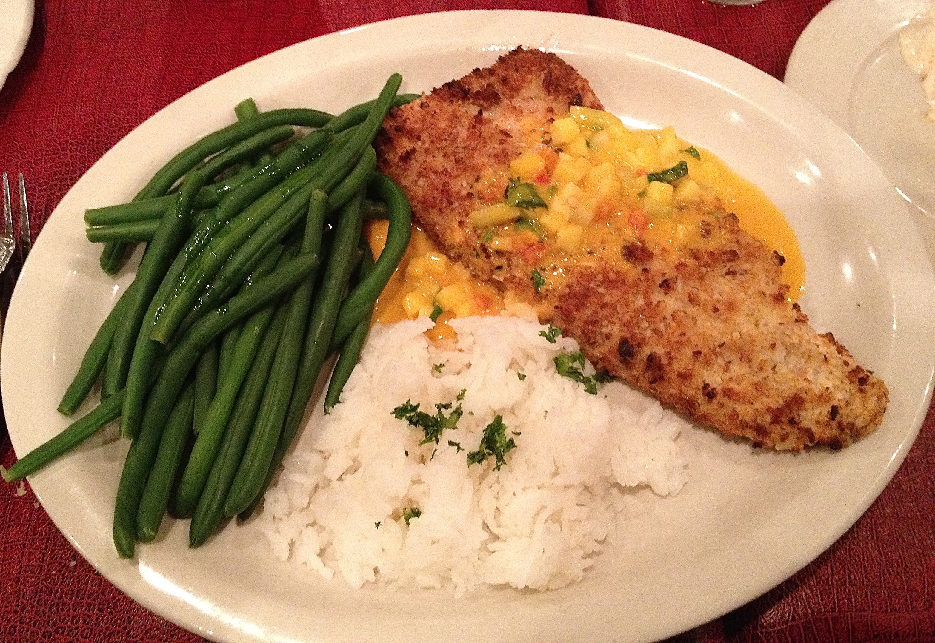 The fish comes with a side of rice and a large helping of green beans. It’s moist and flavorful. The star of the plate is the mango sauce that comes on the fish, featuring large cubes of mango in the sweet sauce.