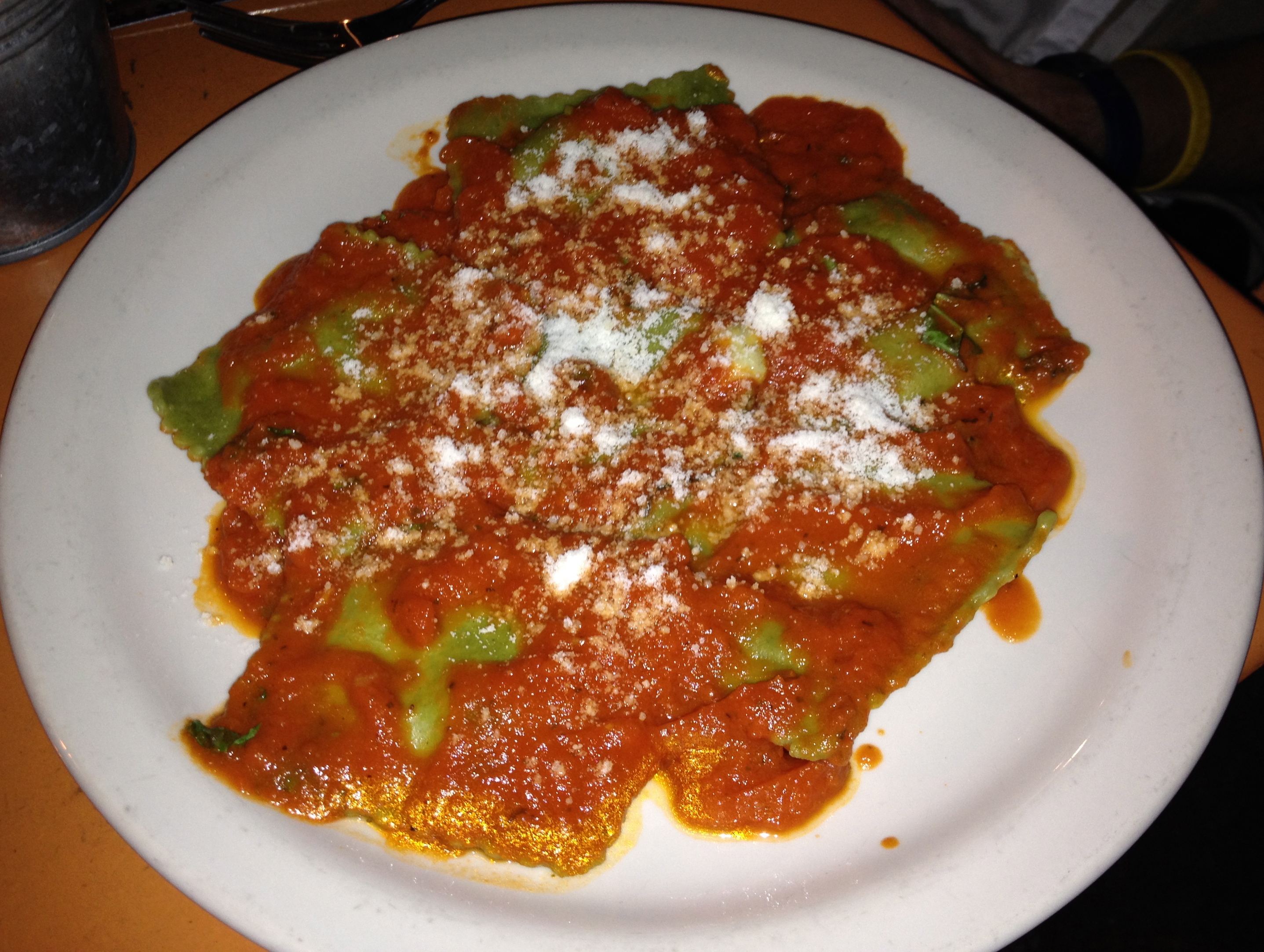 Eve goes with the artichoke ravioli covered in the pomodoro sauce. She was hoping for more chunks of tomato in her sauce, but she enjoyed it just the same.