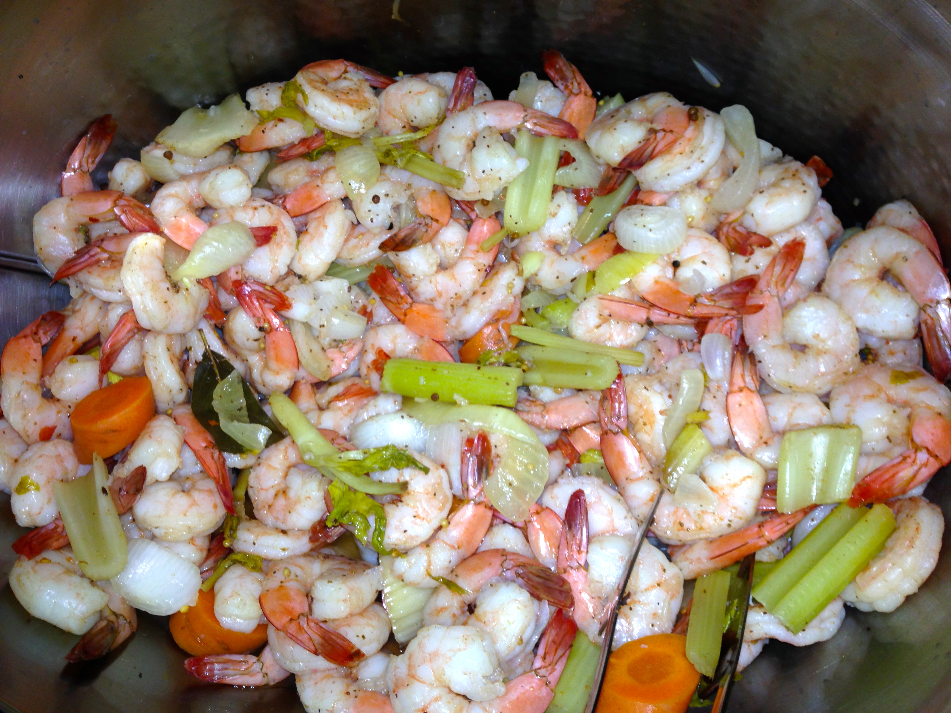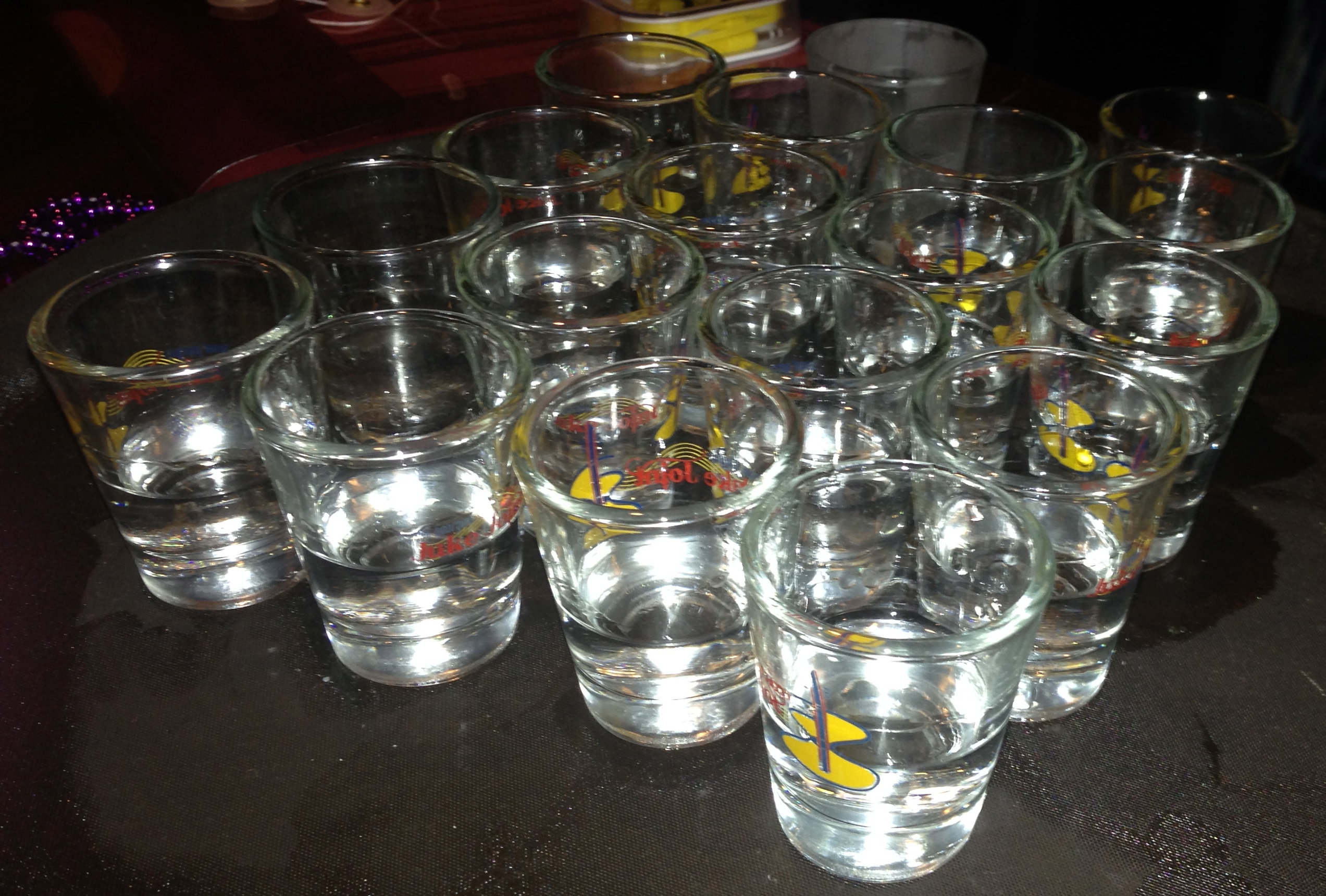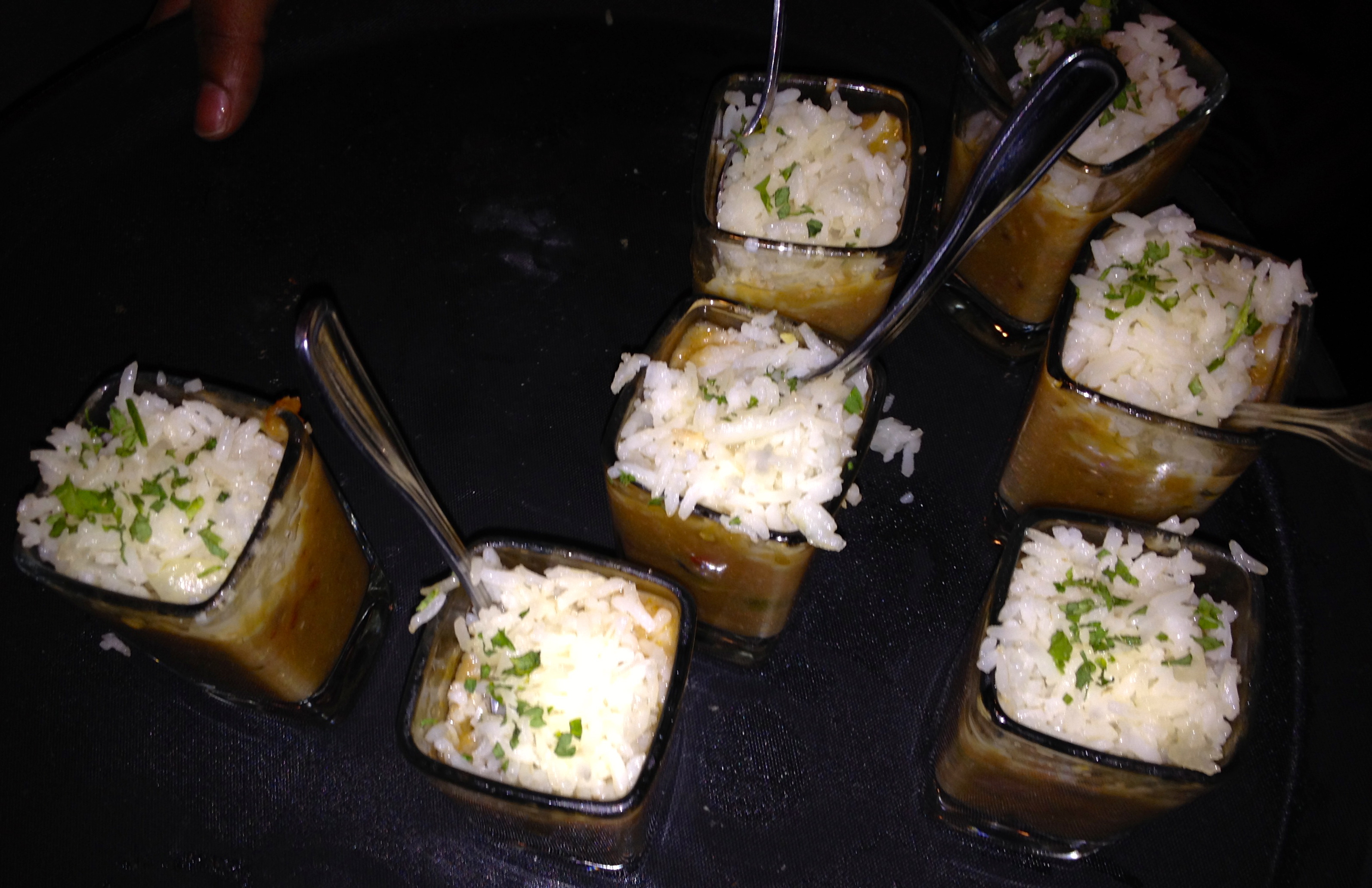 Gumbo in a short glass with rice on the top. There’s shrimp and sausage in those little glasses. We get a few spoonfuls, which is the perfect amount to get the flavors from this delicious dish.