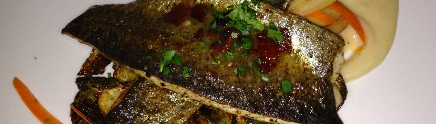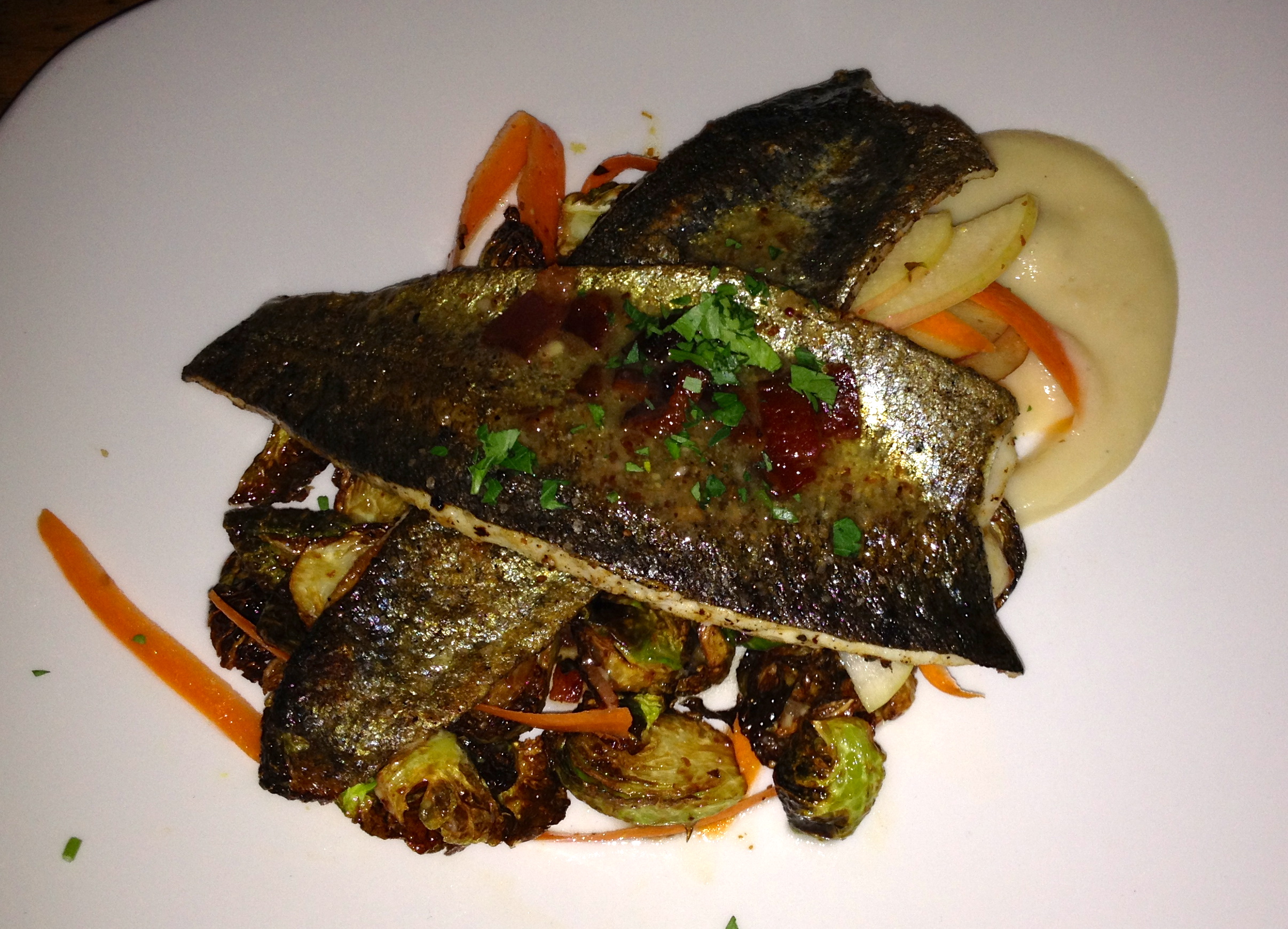Eve goes for the seared Georgia mountain trout, as I knew she would. It comes with celery root puree as well as Brussels sprouts, apple and bacon. The outside is crispy and the inside is moist and tender. The Brussels are almost as good as our faves from the Happy Belly food truck.