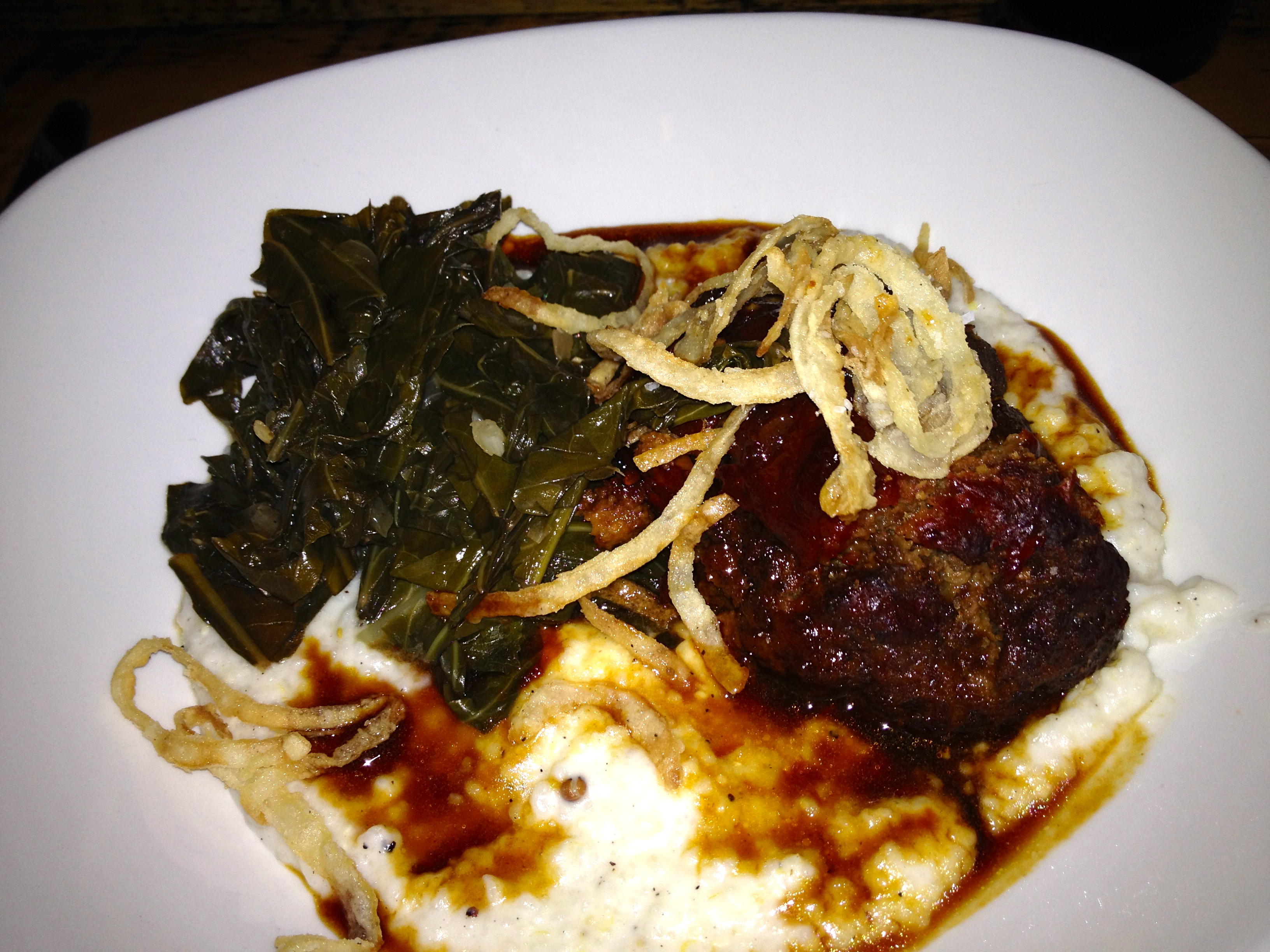 A few minutes later, another portion comes out with a nice chunk of loaf. It’s excellent, but wish I had gotten this one first as the plate I sent back tempered the joy of my meatloaf experience.