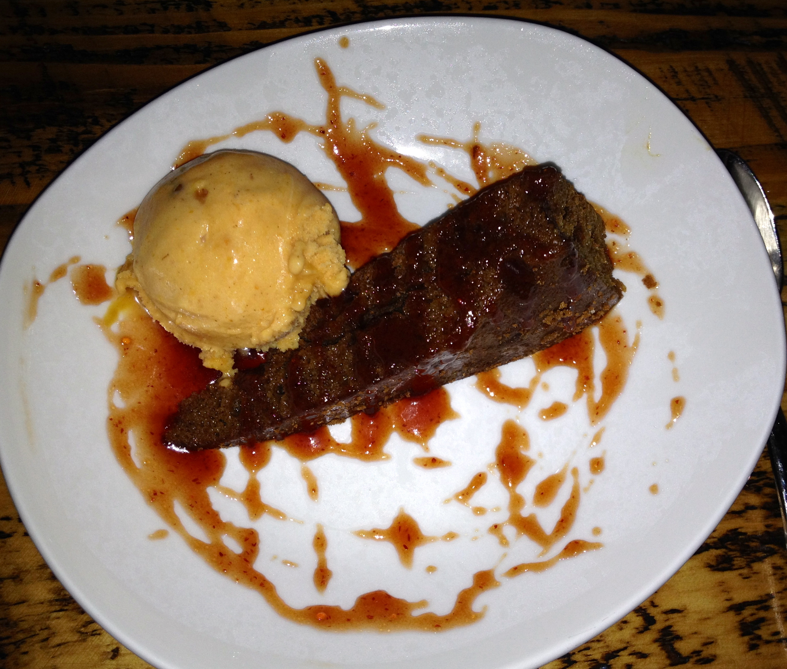 “Fall” is a wonderful seasonal dessert, featuring a ginger spice cake, pumpkin gelato, and a cranberry-caramel glaze. This is worth it for the gelato alone, which tastes like a frozen pumpkin pie. Combine that with the spice cake and the last of Eve’s pumpkin beer, and you have a dessert that will make you “fall over” with joy.