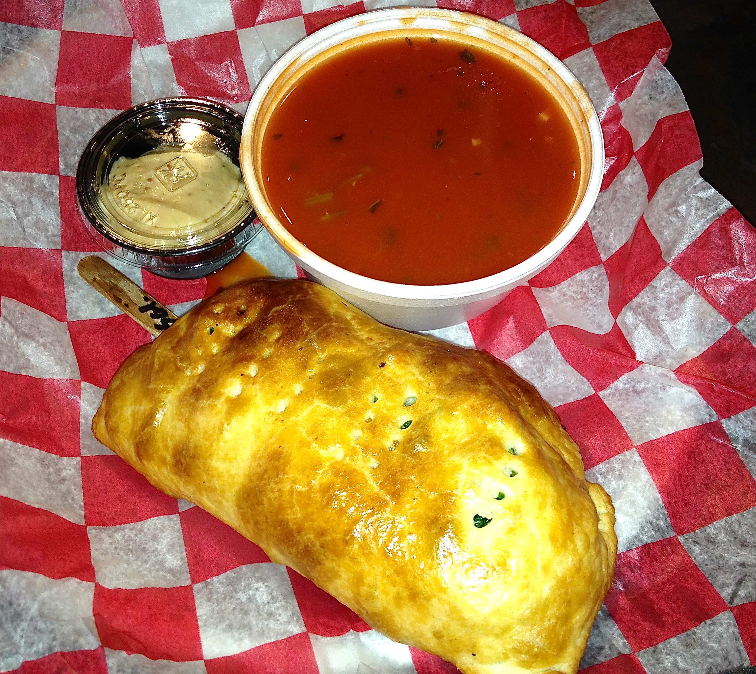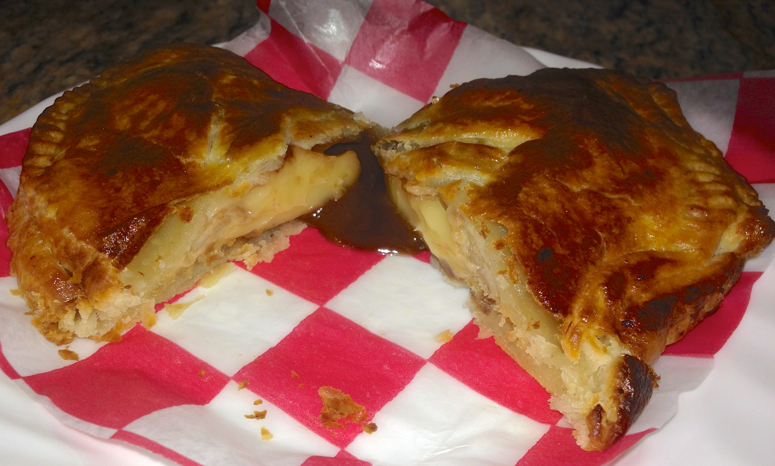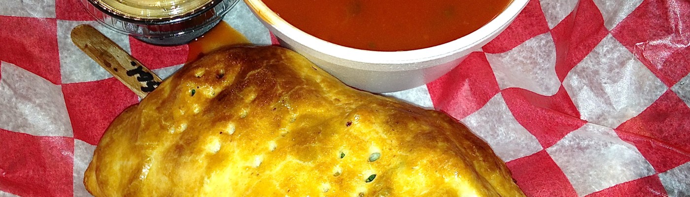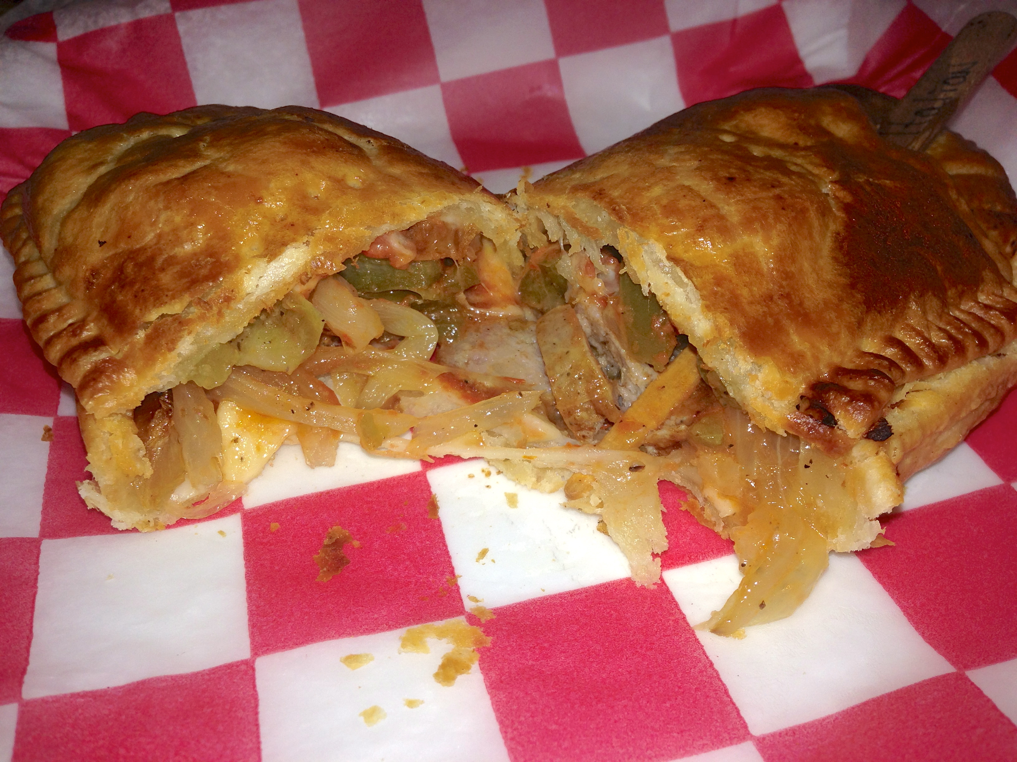 Realizing our photography error at home, we cut into this pie for the photo. Inside is mild sausage, provolone, onions, peppers and tomato sauce. It’s like a calzone with a much flakier crust.