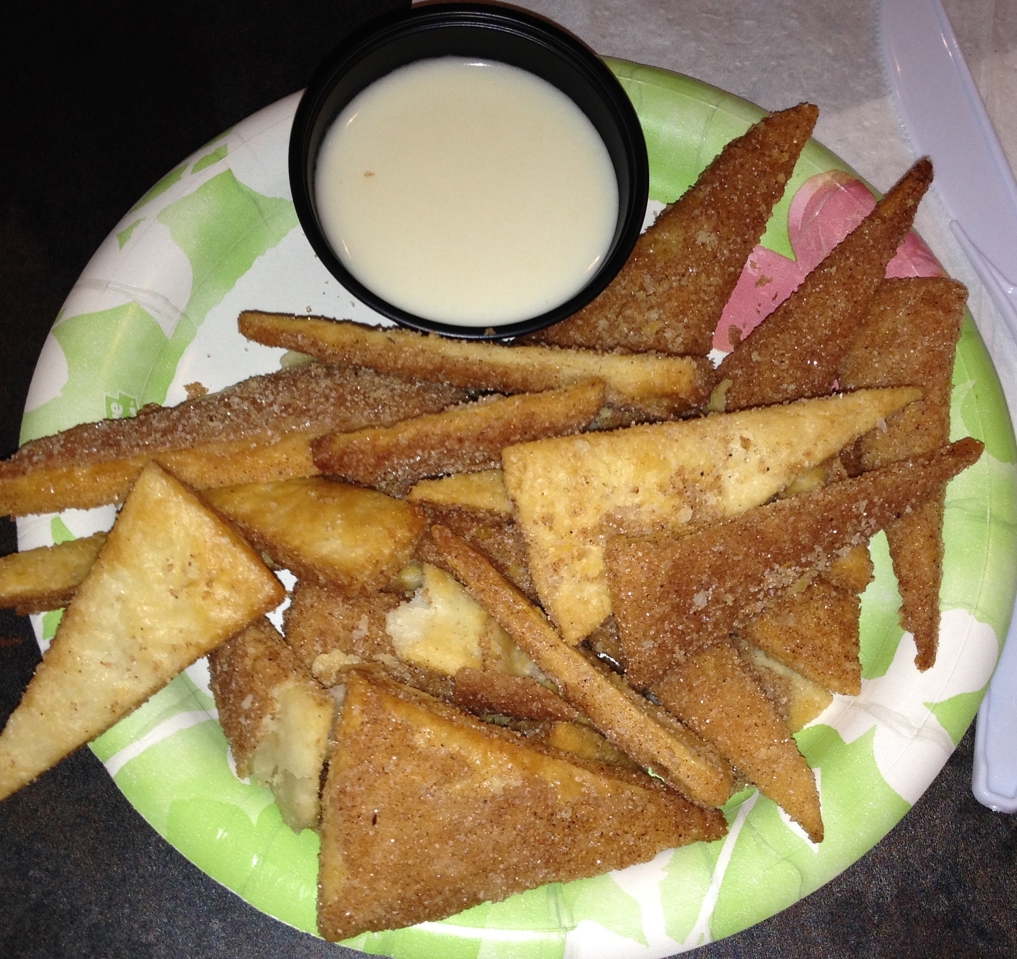 They take the pie crust and bake it with cinnamon sugar. It is served with a sweet cream cheese sauce for dipping. These taste a lot like churros and quickly disappear from the plate.