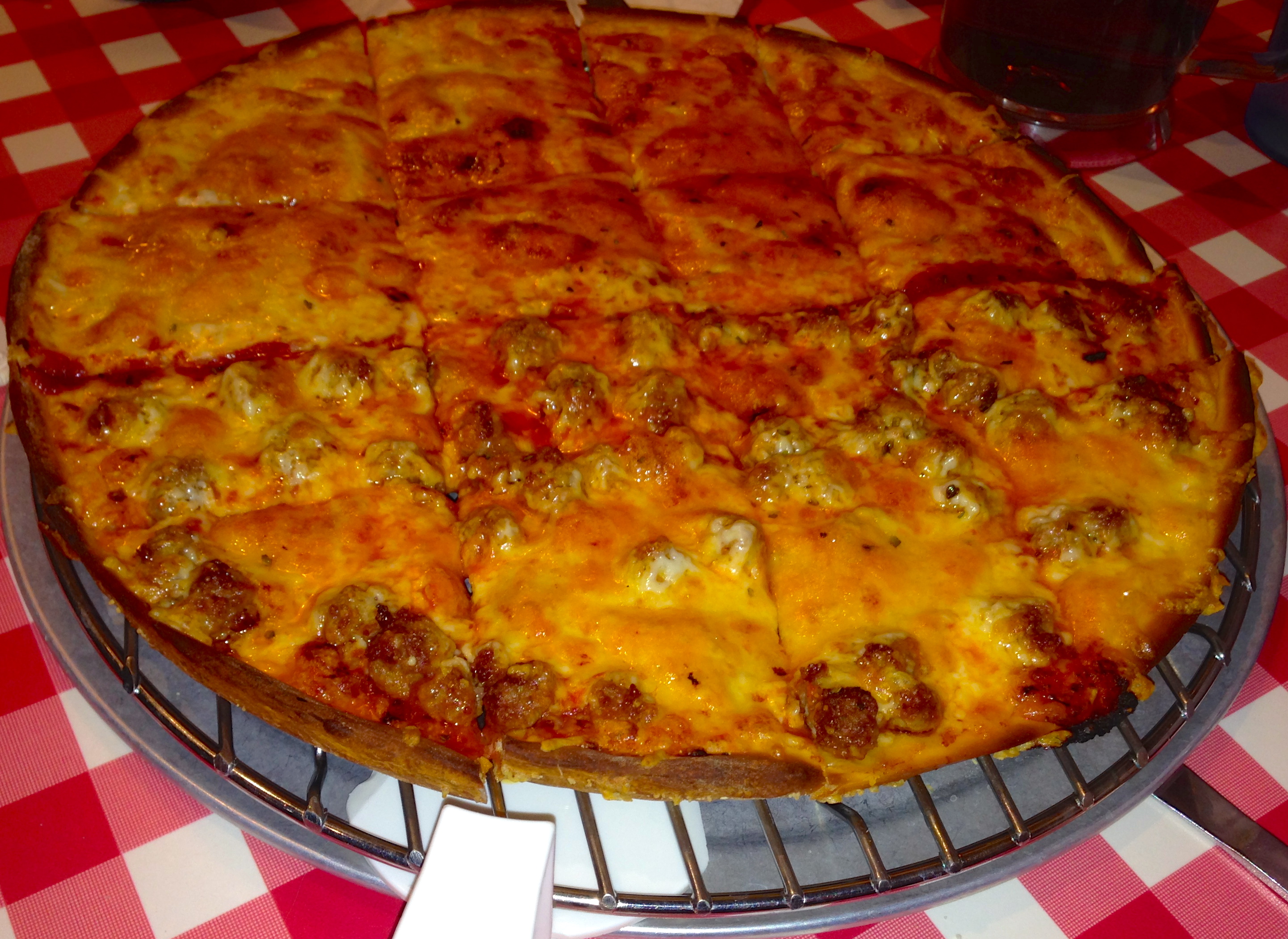 Most Chicago pizzas are thick-crust or stuffed. You can get those here, but Aurelio’s is famous for their thin crust pizza, and we order one.