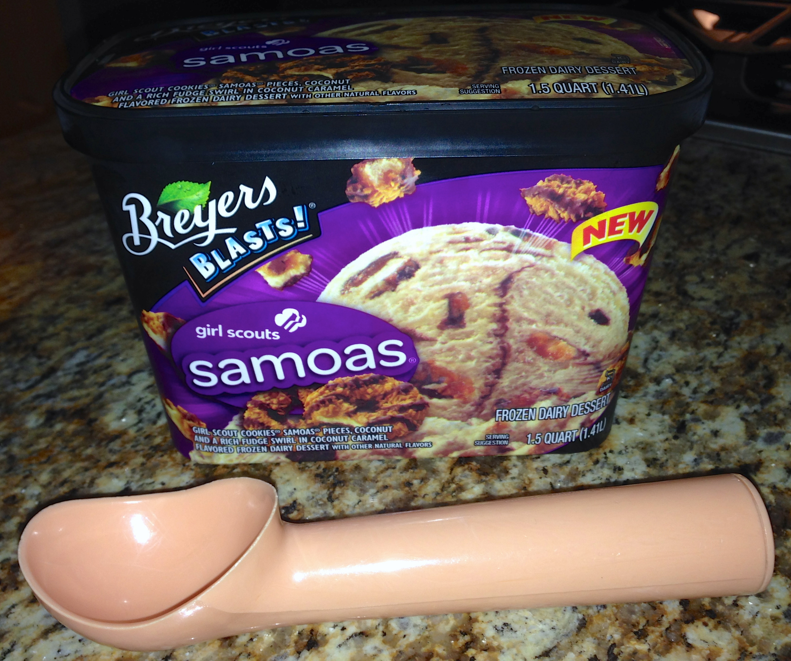 Have you tried this “frozen dairy dessert”? Someone found a great use for broken Girl Scout cookies. Available in Thin Mint as well, which Eve is dying to try.