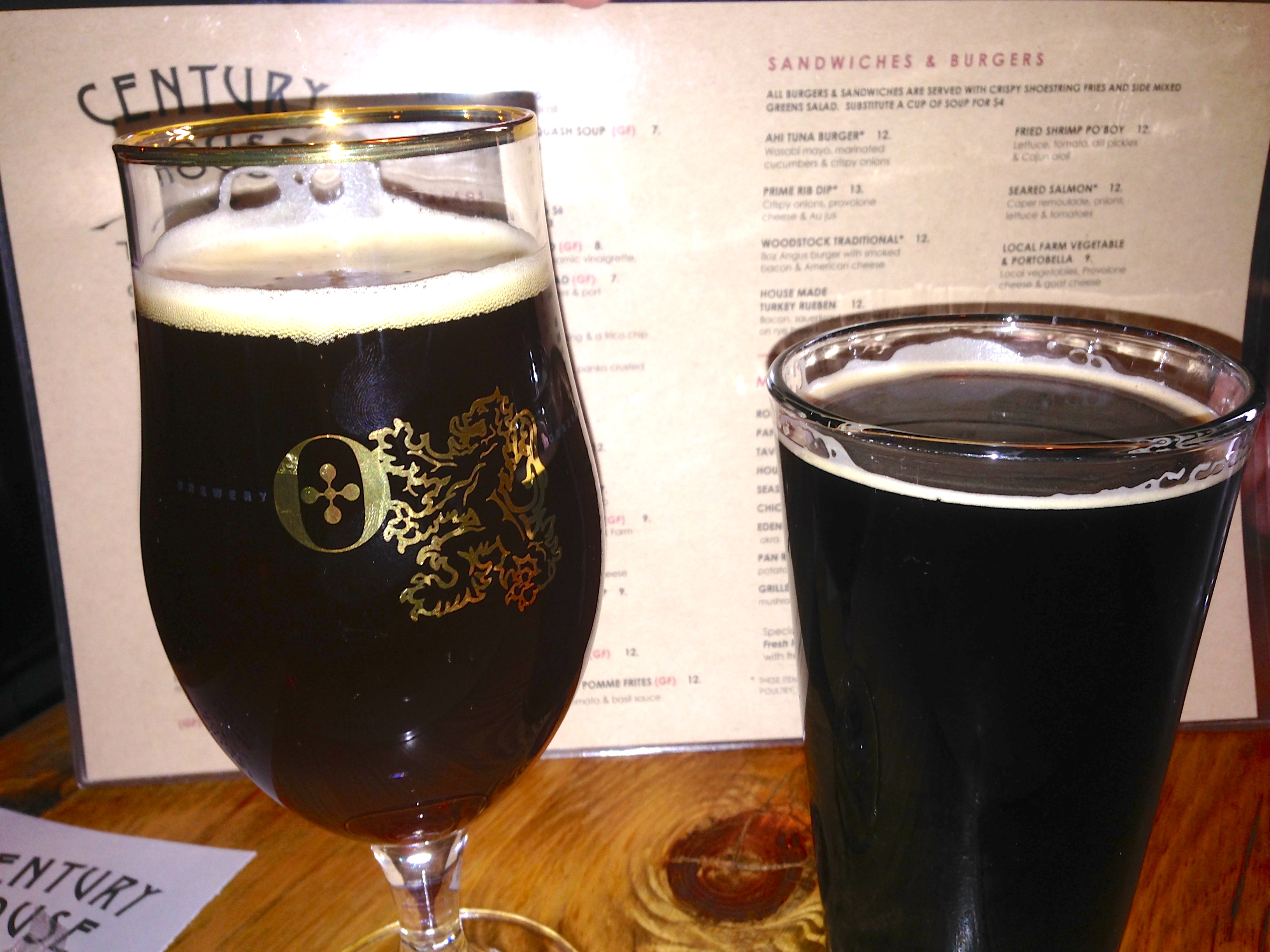 The Ommegang Abbey is a dubbel, served in the proper Belgian chalice. On the right is a very local beer, the Red Hare Sticky Stout from Marietta. The Red Hare has a strong coffee taste. The Ommegang is the better of the two, but both are excellent beers on this cold night.