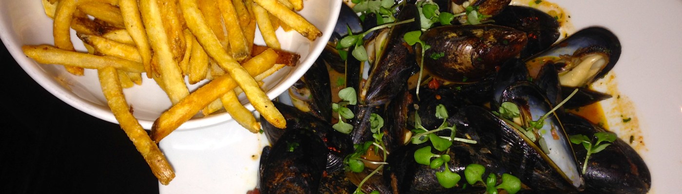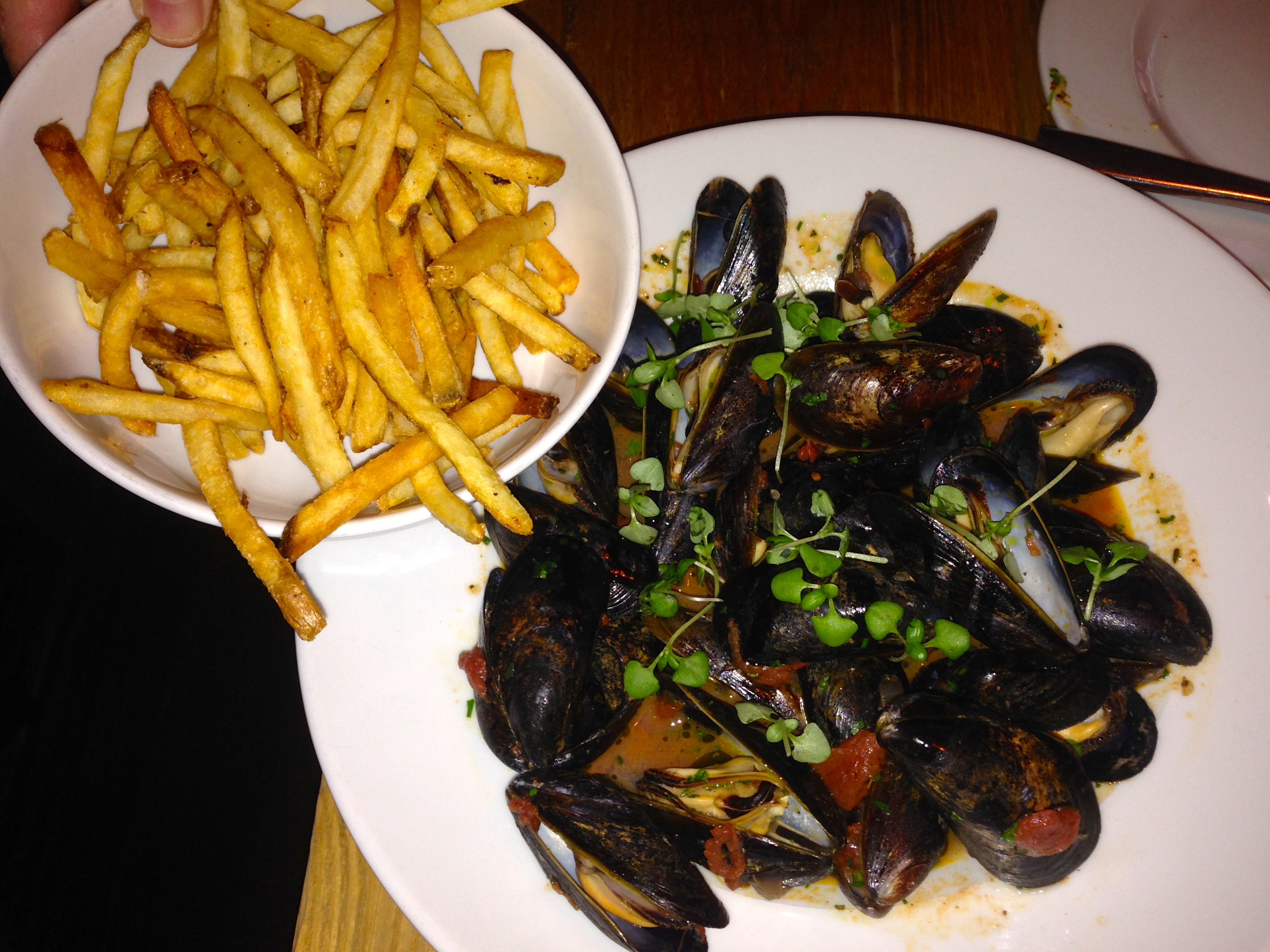 It’s a big bowl and comes with frites. It’s a good thing that one of us is drinking Belgian beer. The light tomato broth is great for dipping the fries.