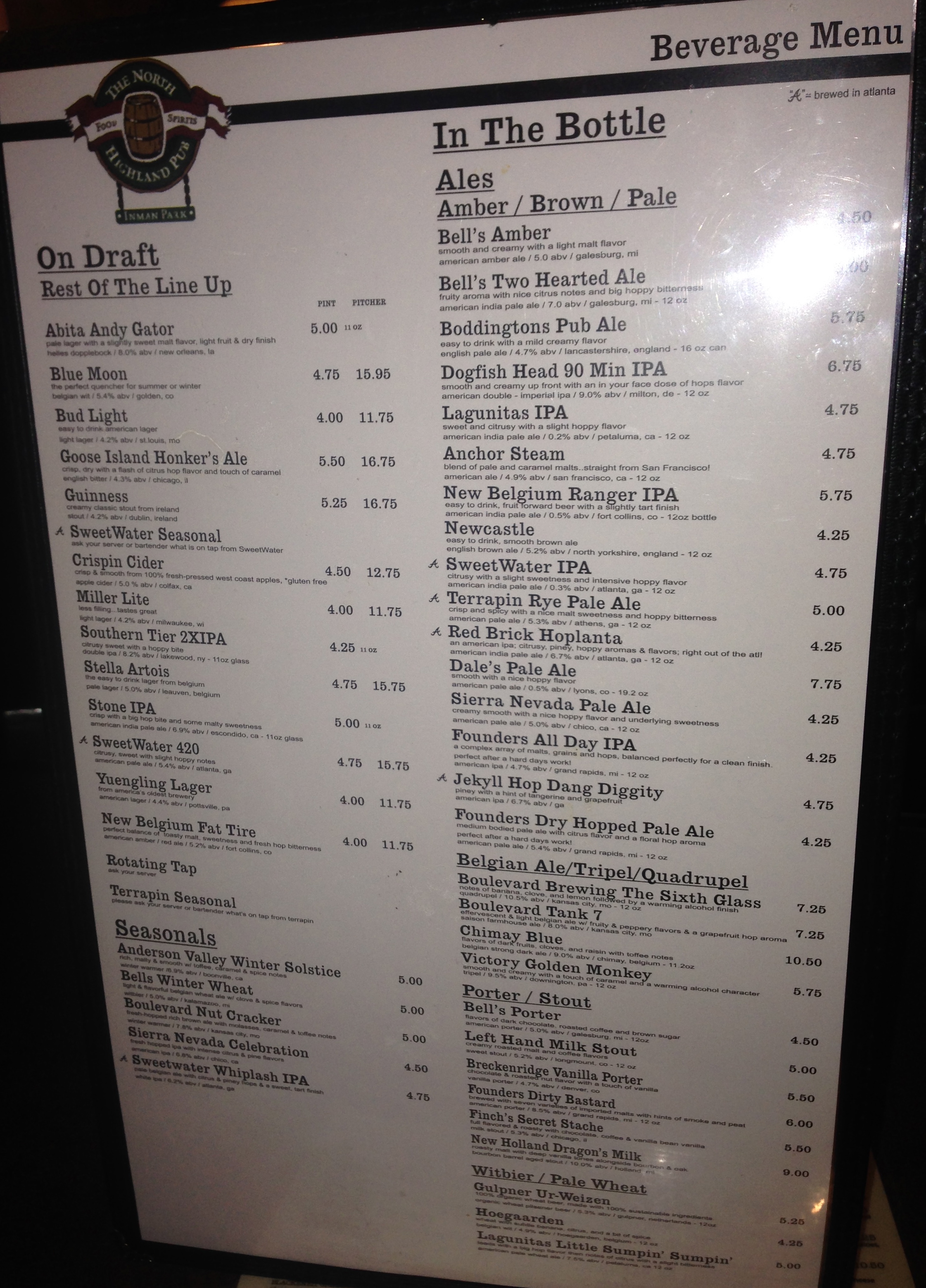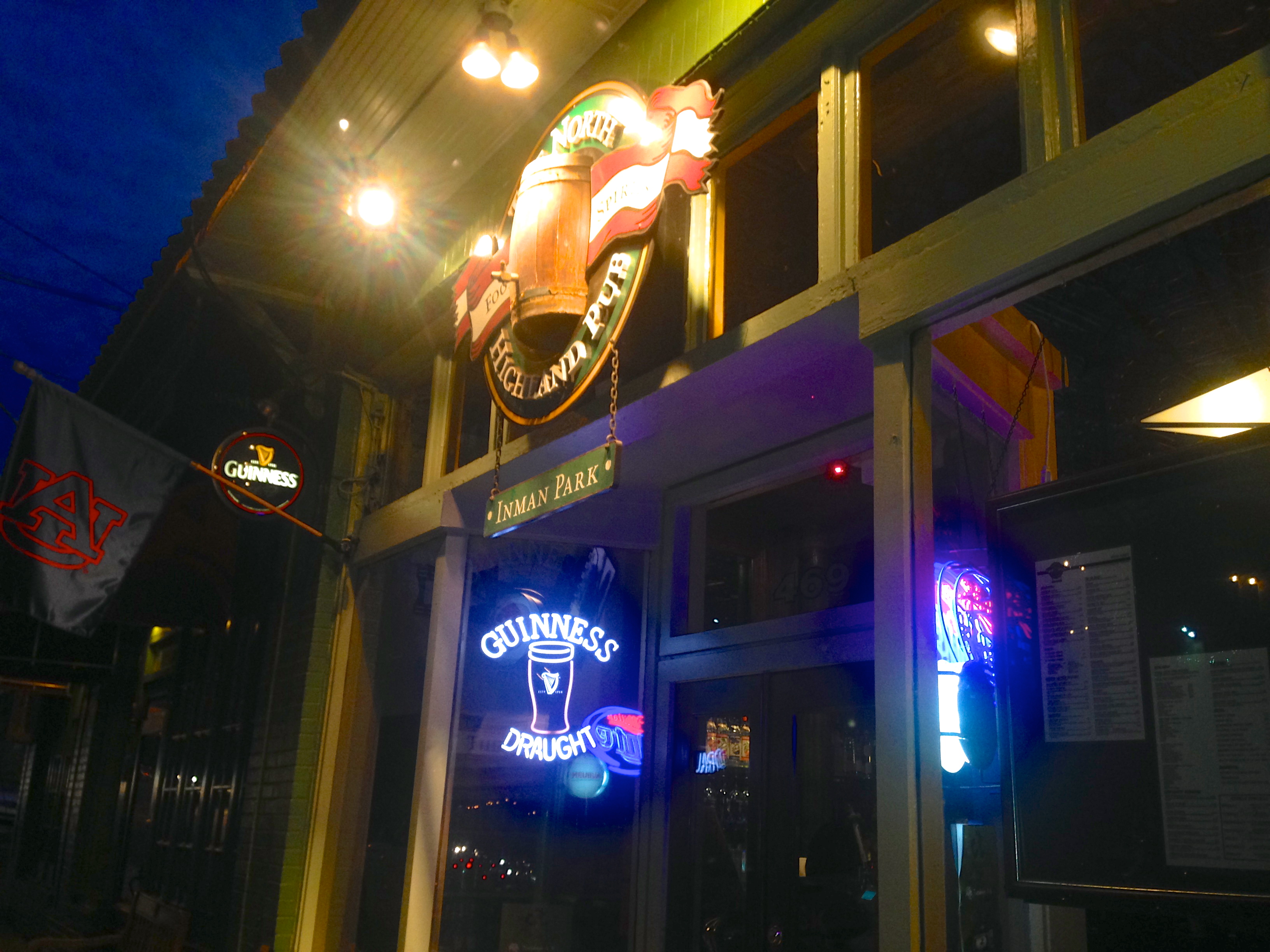 Date Night heads to the Highlands, North Highland that is, for our latest adventure. Located between Manuel’s and the group of buildings that house Fritti, Soto Soto and Pure Taqueria, is a small grouping of four restaurants that we have not tried. Tonight, we hit two of them. Our main destination is Folk Art, which is recommended to us by our work pals Sonya and Elizabeth. Due to an unexpected lack of traffic on this Friday, we arrive too early for dinner. What to do? Duck into the North Highland Pub for drinks, of course.