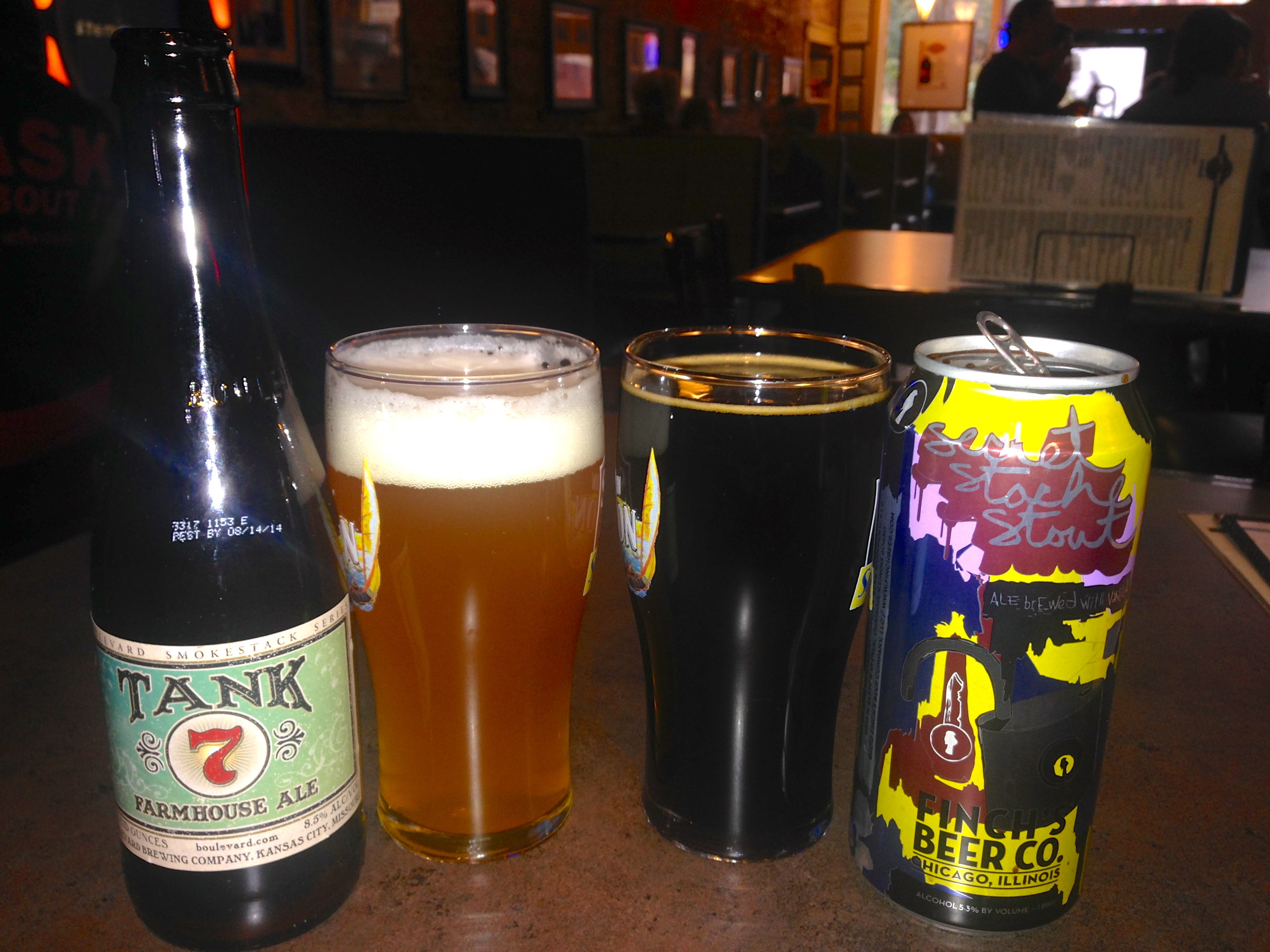 I go with the bottled Boulevard Tank 7 Saison and Eve chooses Finch’s Secret Stache Stout. The saison is hoppy at first, but it finishes on a citrus note. The Secret Stache is a good stout, with a strong taste of coffee.