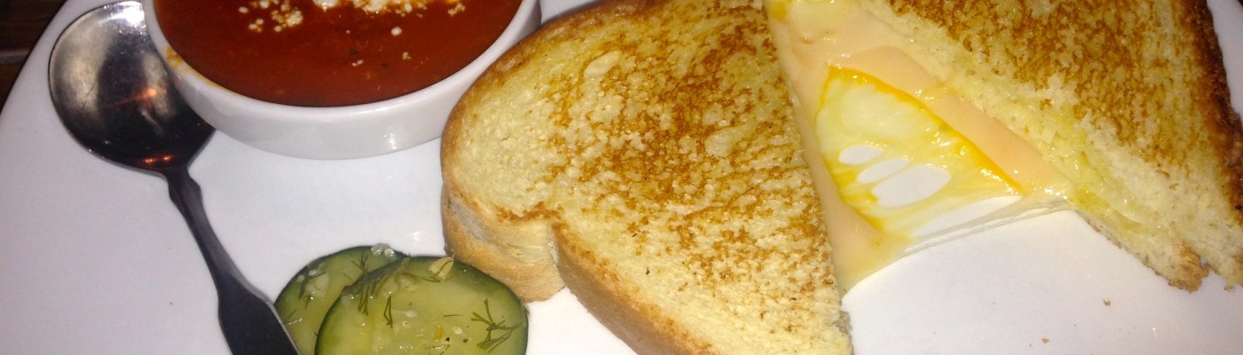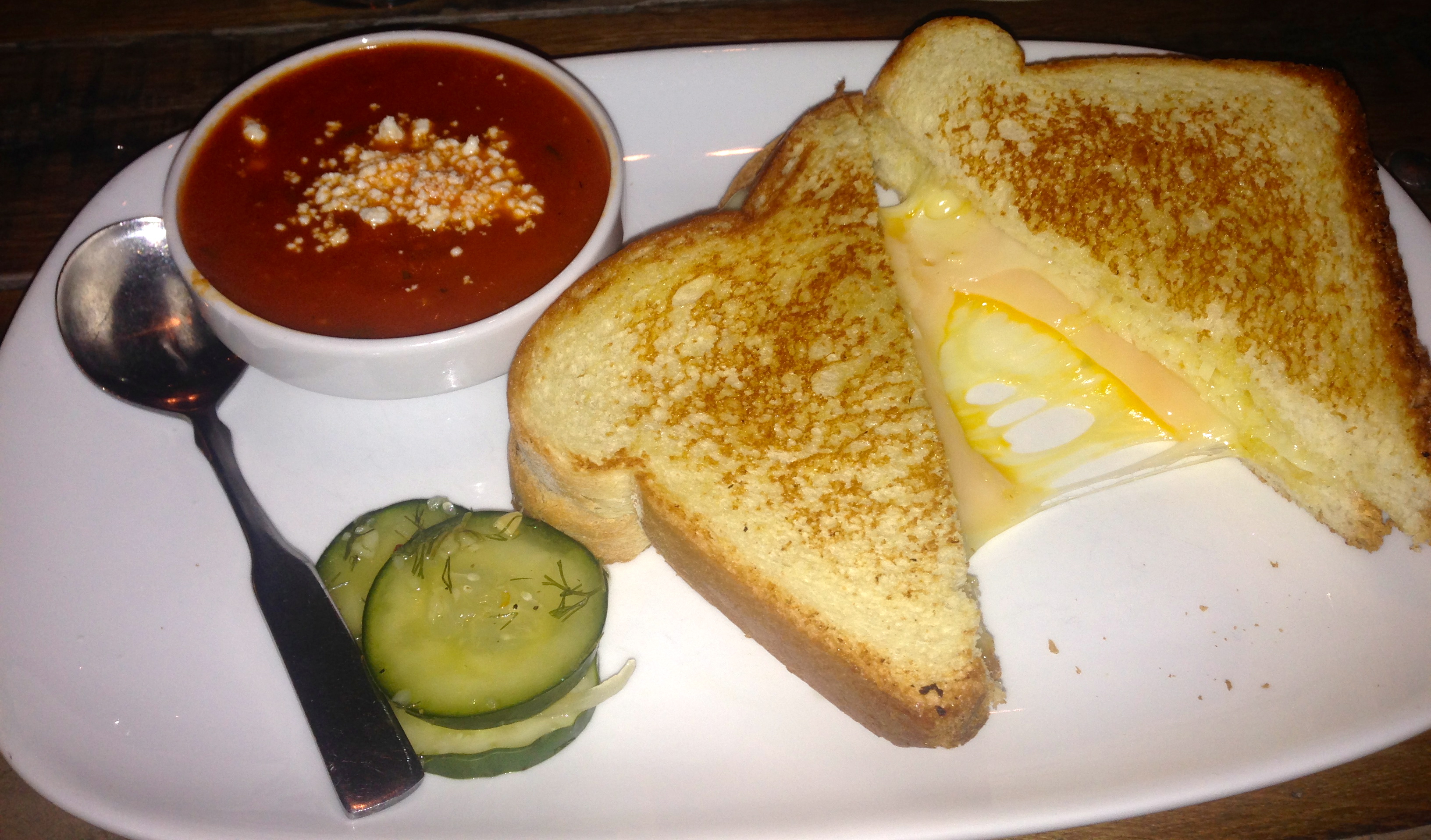 Say cheese! There are five of them in the grilled cheese sandwich: gruyere, cheddar, brie, provolone and swiss. The sandwich is hot, gooey, buttery and very enjoyable. It comes with a side of thick tomato soup, which tastes like tomato sauce.