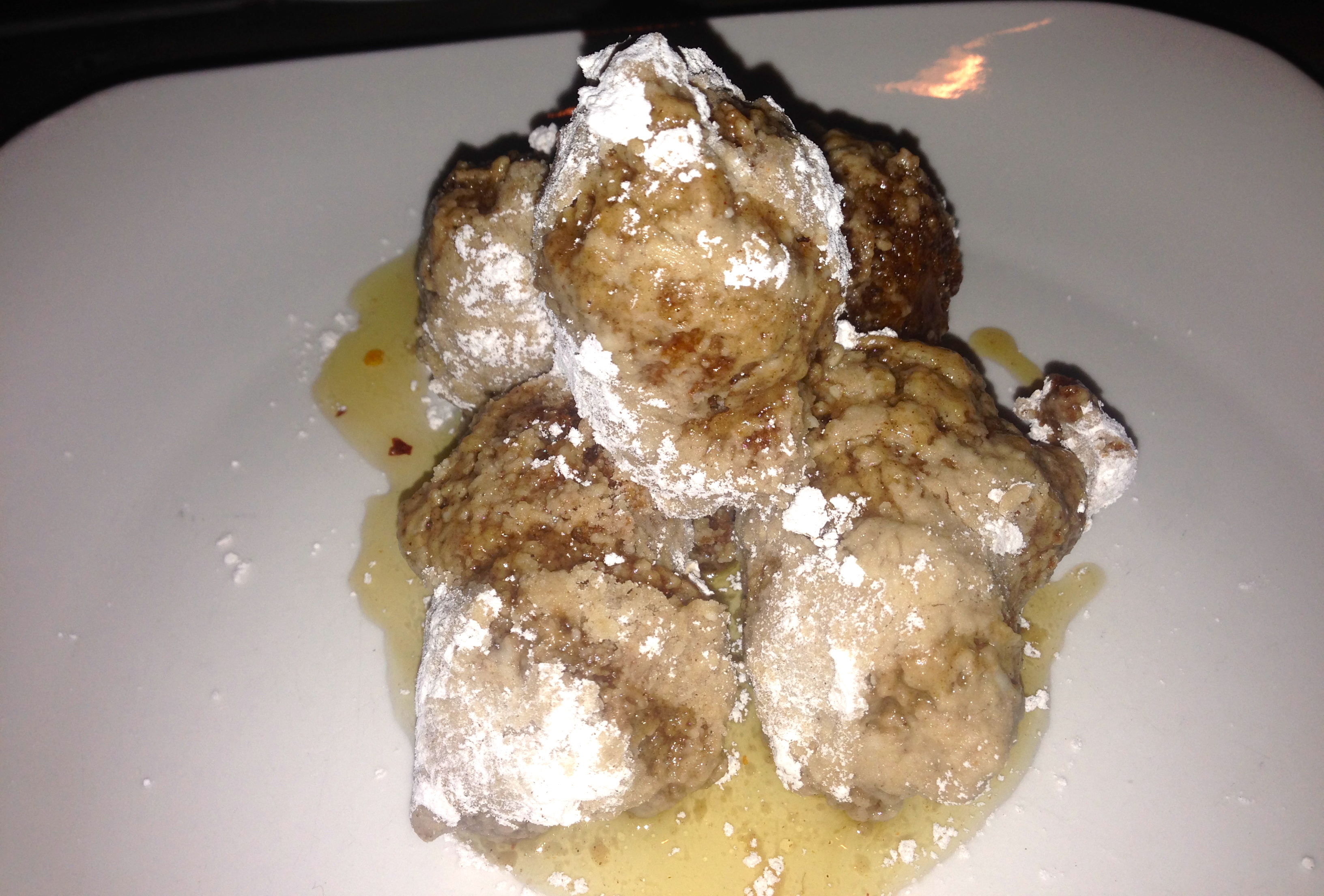 The sweet potato beignets come drizzled with a honey and ginger sauce. These are not light and fluffy as you may expect. They are rather dense and remind us of bread pudding balls. Tasty, but don’t expect what you get in New Orleans. We take a couple of them home for dessert the next day.