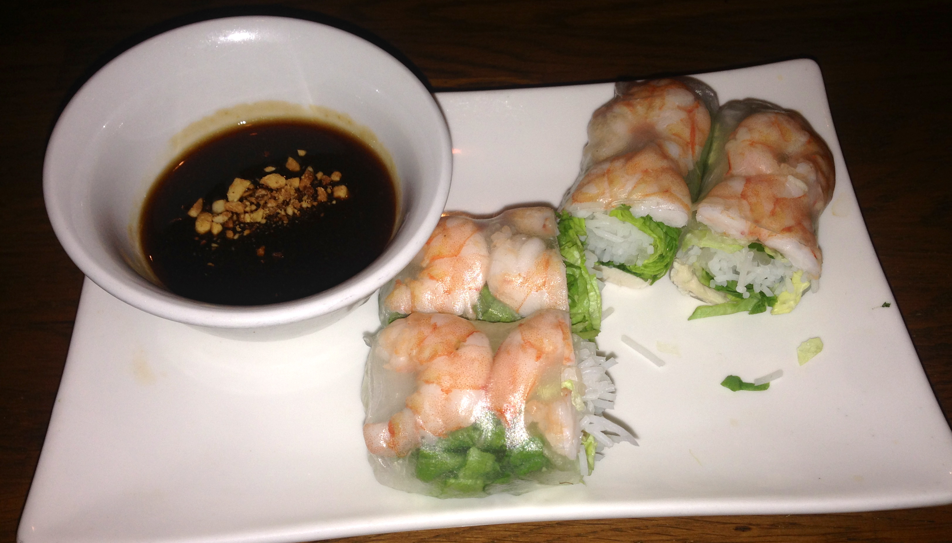 After a lengthy menu study, we order the spring rolls, two plump rolls full of shrimp and chicken. They are perfect for sharing. How do they get all of that filling into the thin rice wrap without it all bursting out? We could never make this at home.