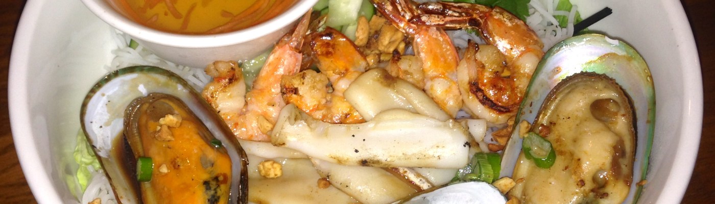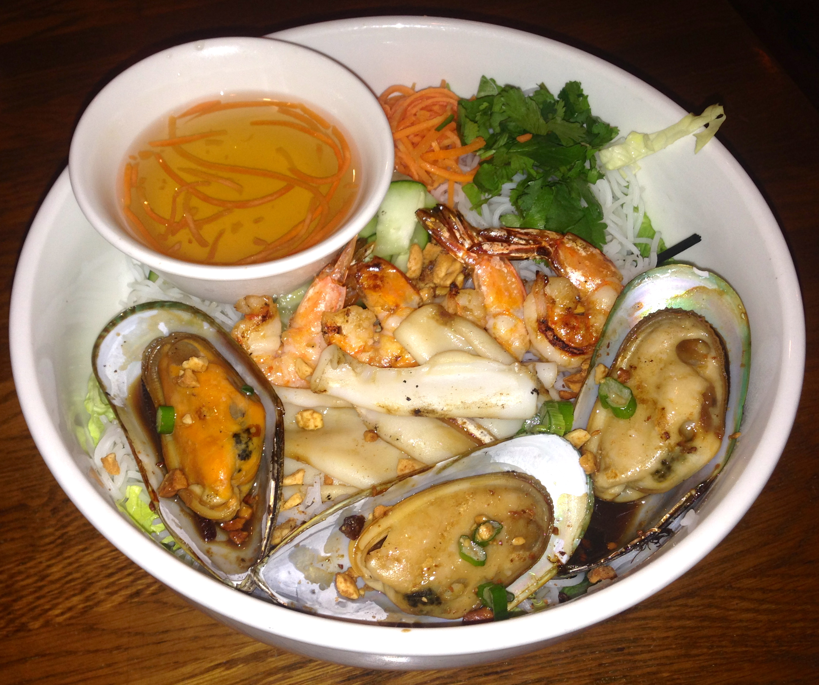 We also order a seafood rice bowl. It comes with plump mussels, shrimp and some calamari tubes. There’s a lot of rice noodles and lettuce under the seafood, which is served cold. It comes with a light citrus dressing. Everything in this bowl is delicious.
