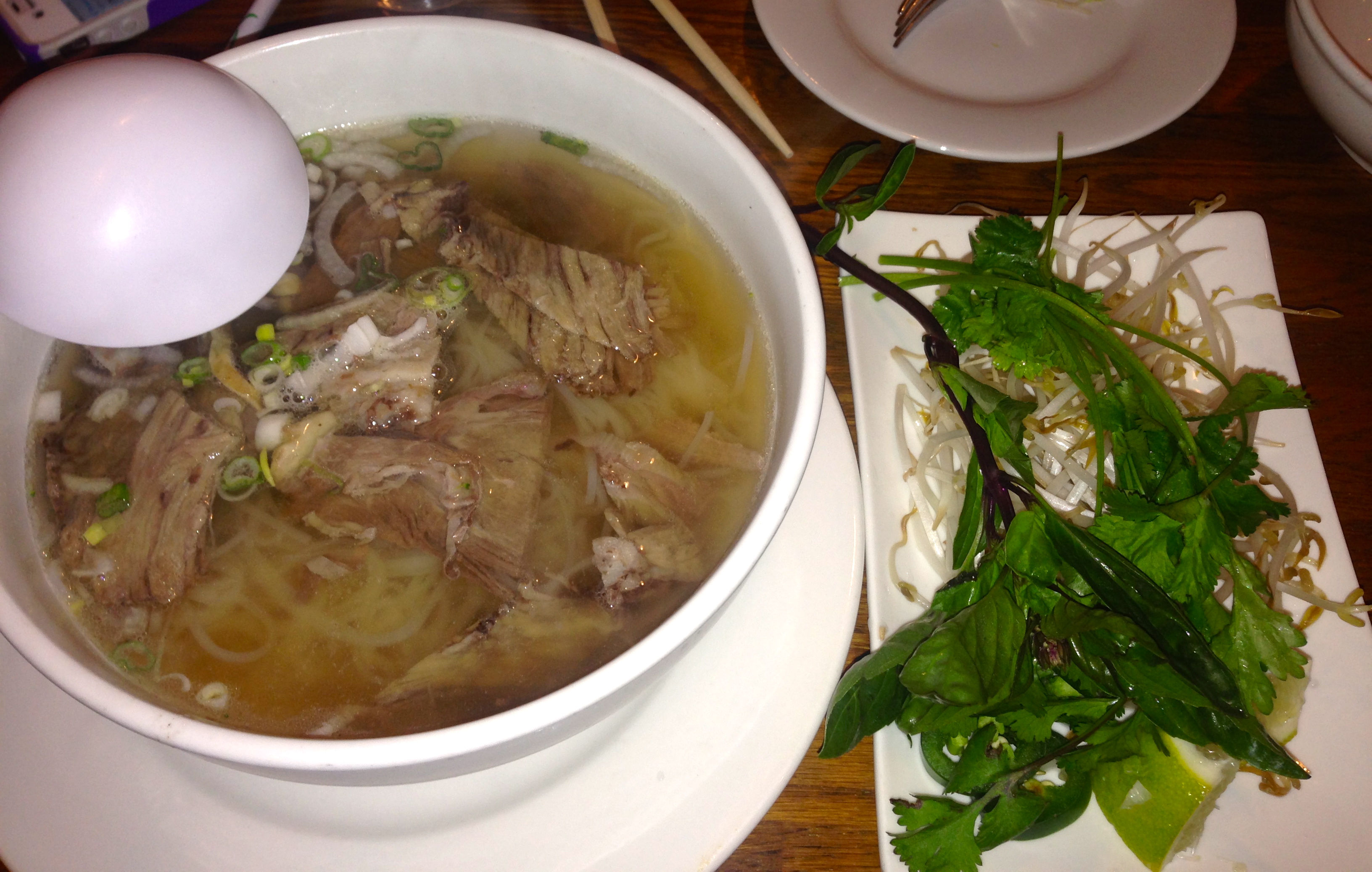 For those who have not done pho before, this is what a bowl of beef pho looks like. You throw the sprouts and herbs in the bowl and you get a tasty concoction. It’s all very fresh, and actually good for you. This is an excellent dish.
