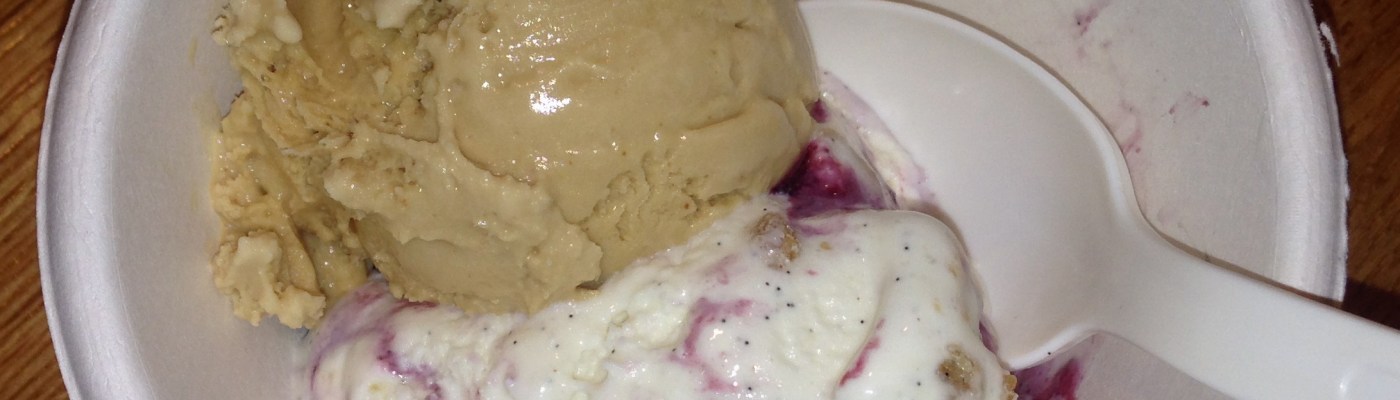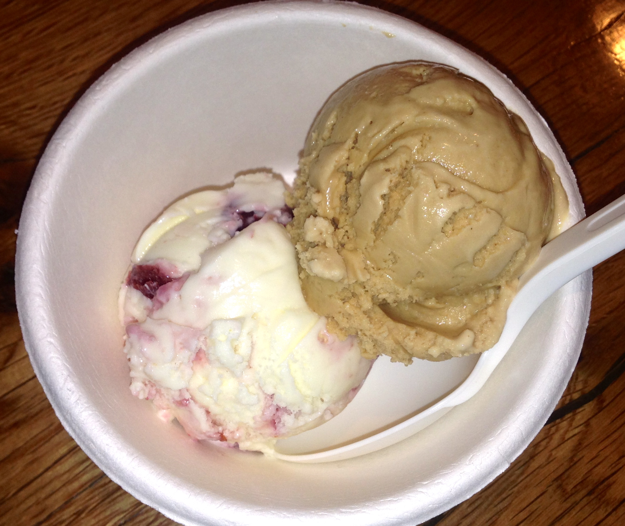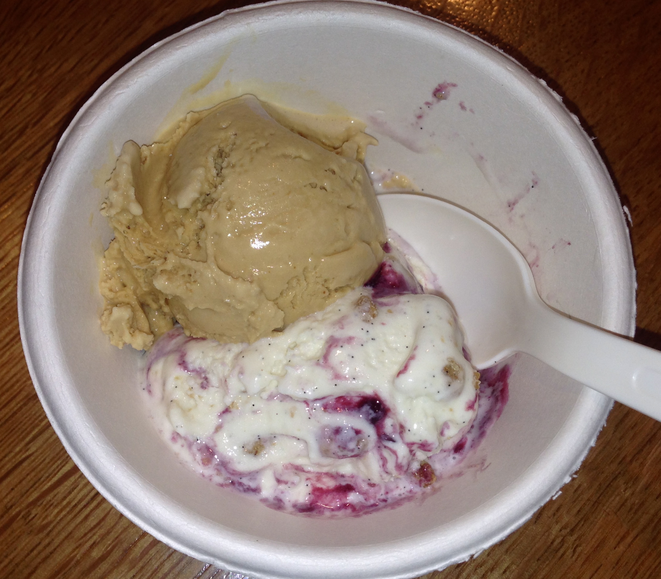 Eve goes for a salted caramel and brambleberry crisp. The brambleberry is a mixture of blackberries and black currants. It’s the best ice cream we eat tonight. You can really taste the salt in the salted caramel. It’s a good flavor to go with the sweet ice cream.