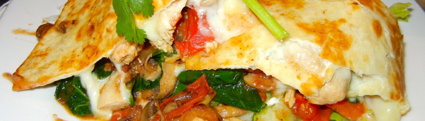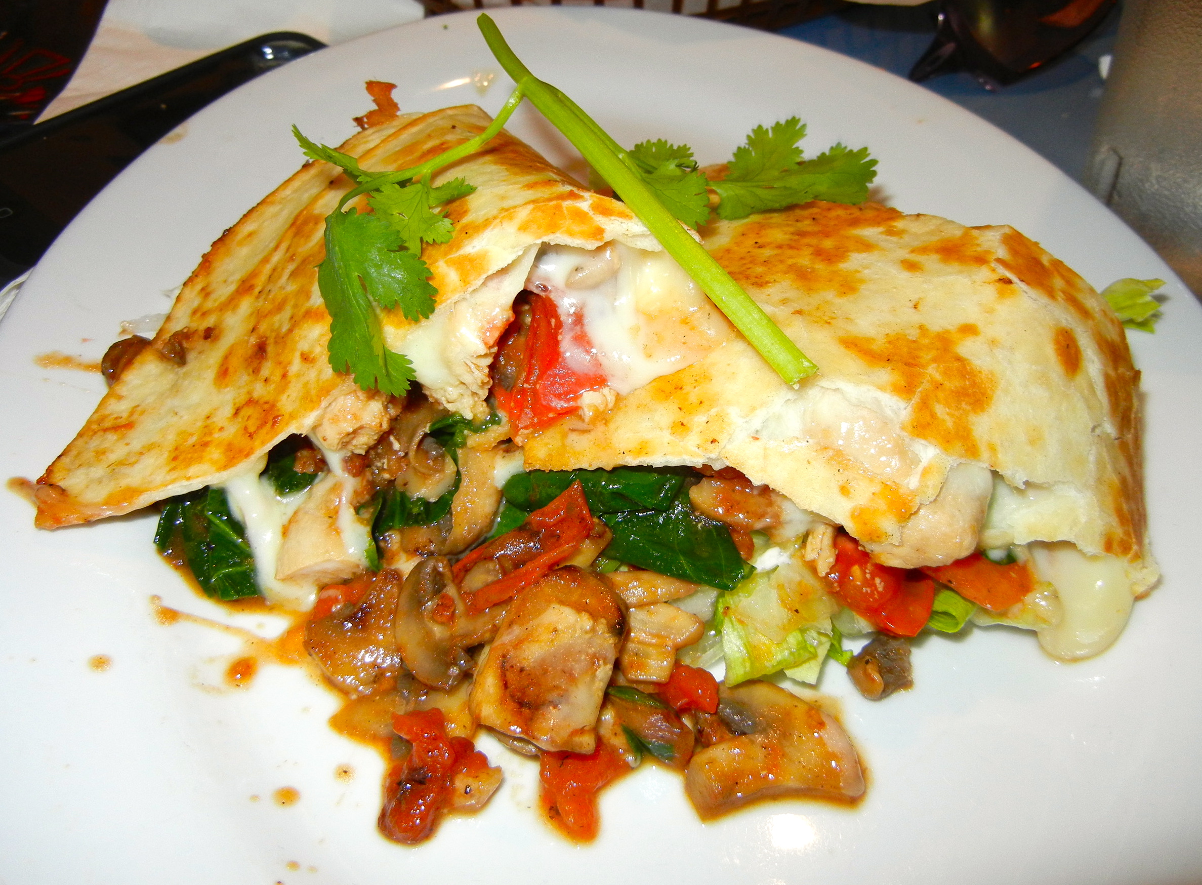 Here’s the dish that keeps us coming back, the California quesadilla. Chicken breast, spinach, mushrooms, tomatoes and cheese in a flour tortilla. It’s fantastic and is ordered by one-fourth of our group. It’s big and runny and you can barely pick it up. Even though I am hungry, I can’t finish it.