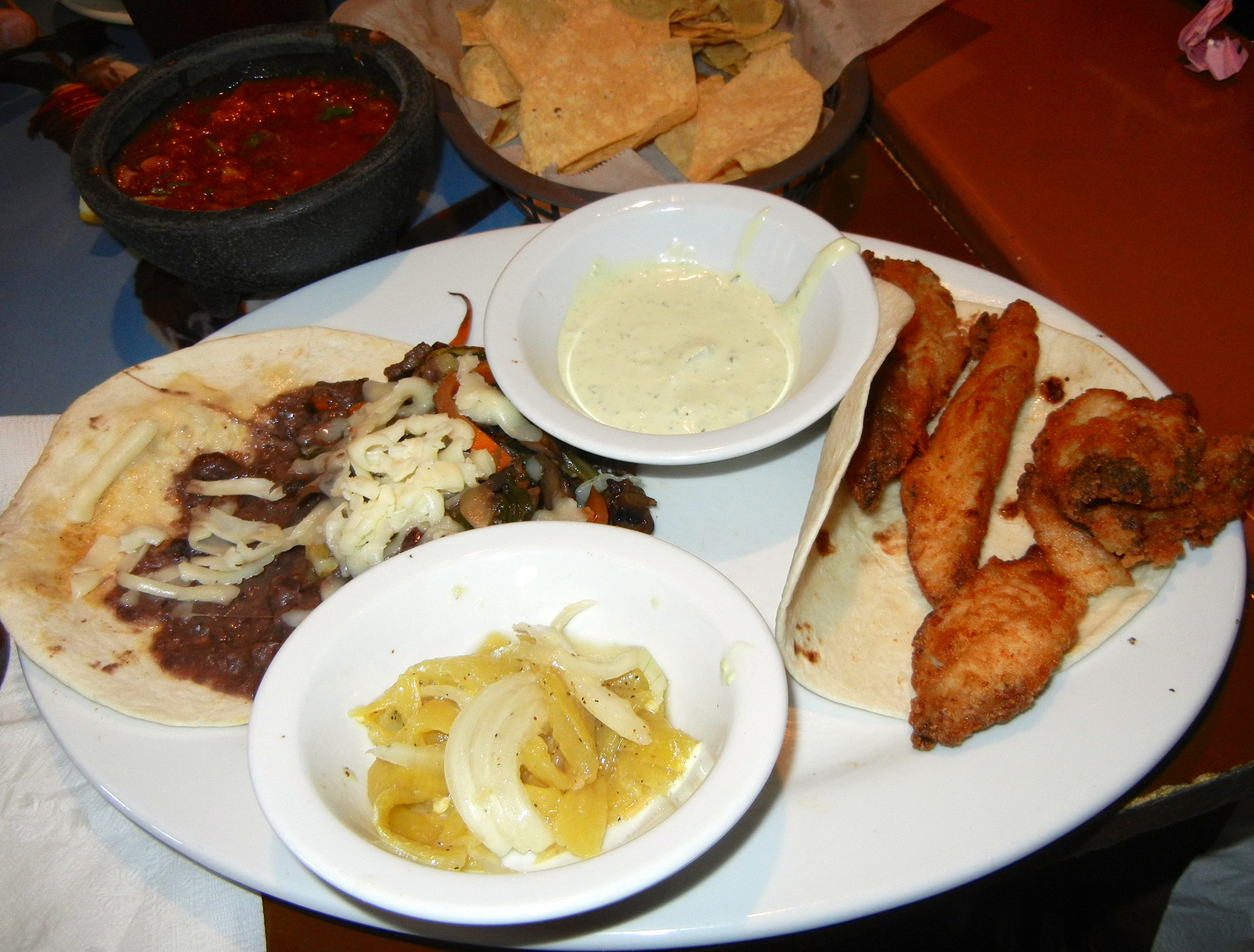 Eve orders two soft tacos. On the left is the veggie taco and the one on the right is a deconstructed fish taco. She got the peppers and sauce on the side. This is a lot of food. The veggie taco is surprisingly hearty and I get to finish it.