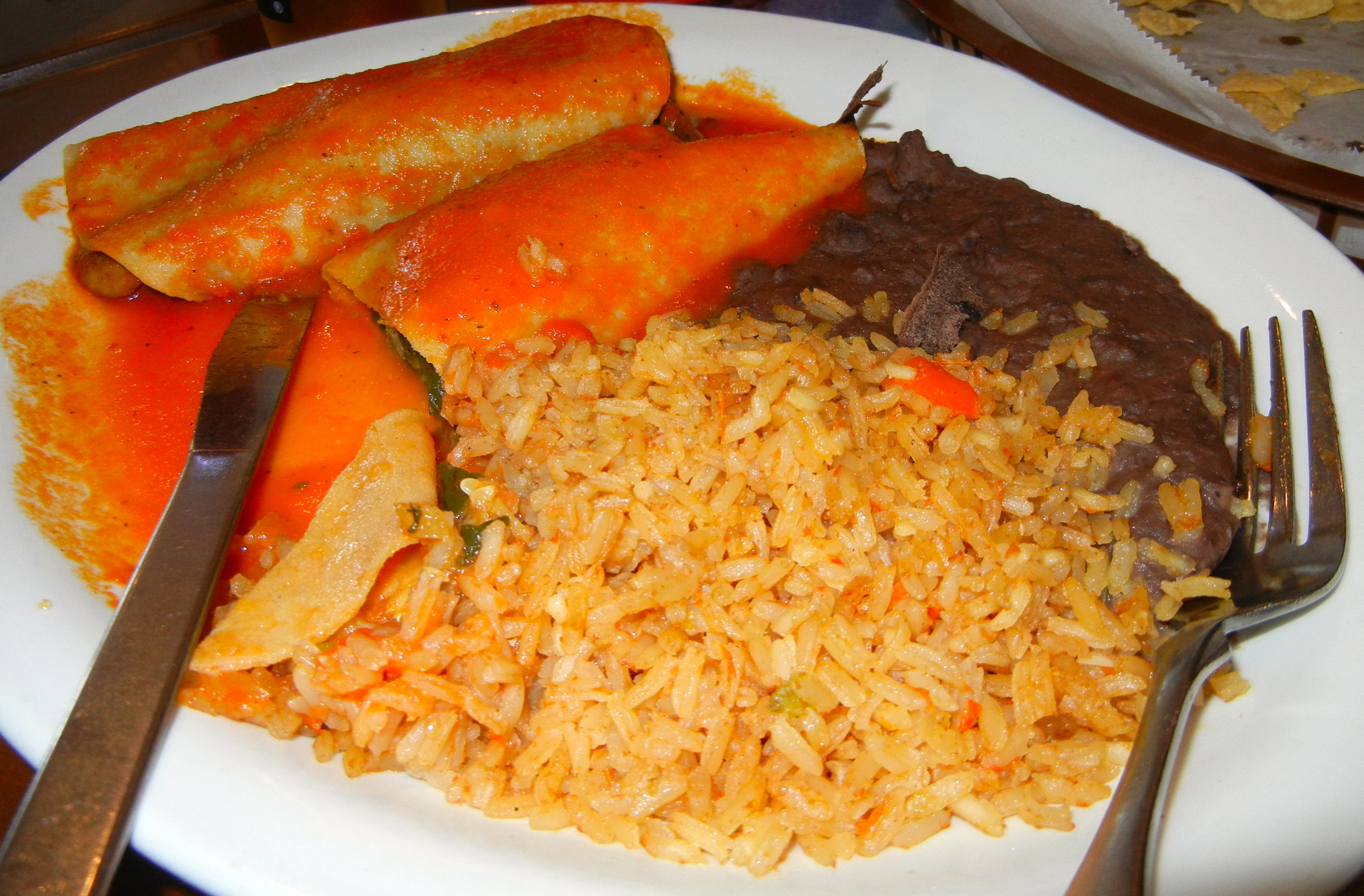The vegetable enchiladas are stuffed with spinach, mushrooms, zucchini, carrots, celery and onions.