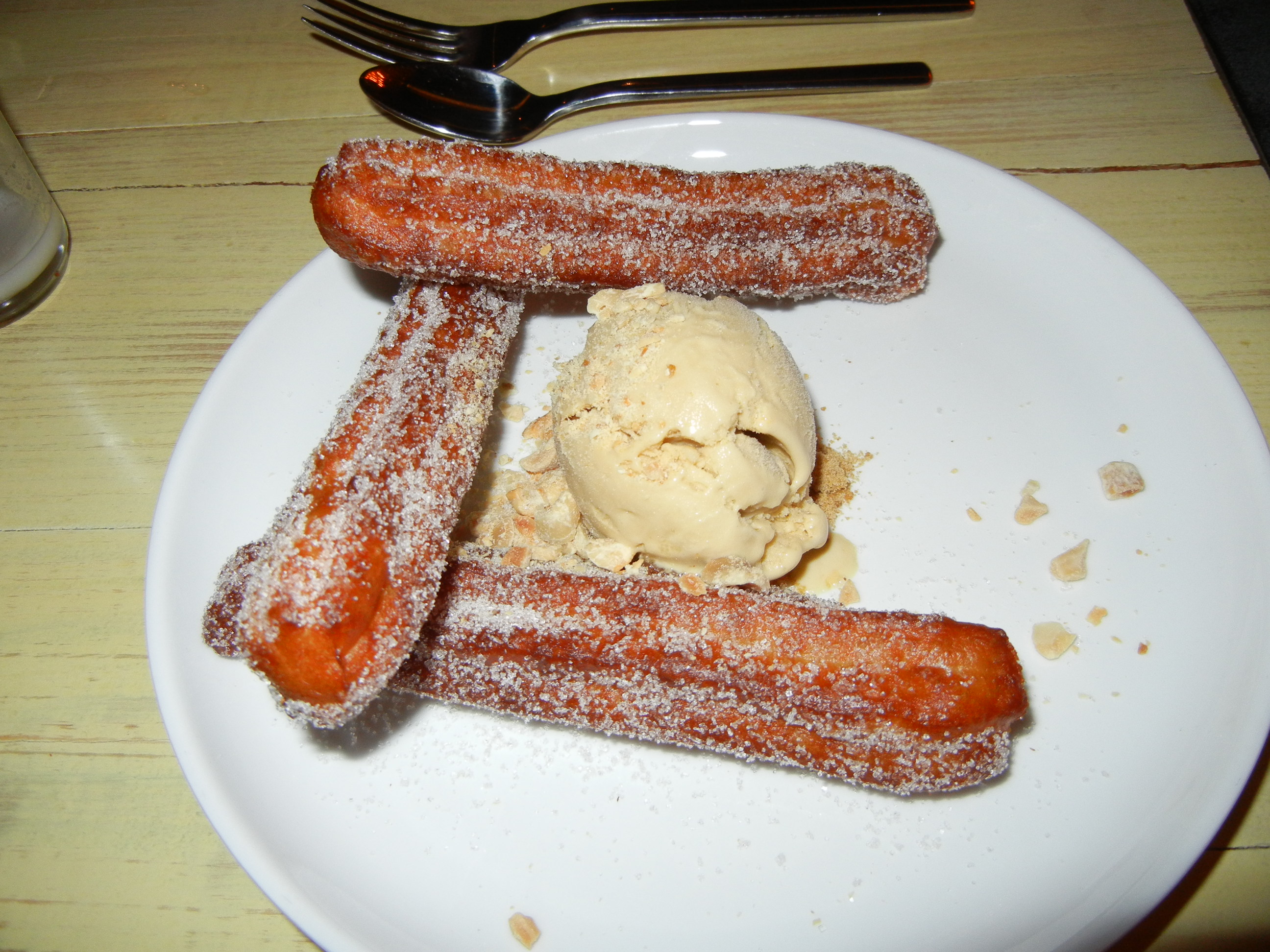 Two desserts get photographed. The churro is the traditional Mexican dessert. The fried dough is light inside of the sugary coating. The peanut butter ice cream has big chunks of nuts.