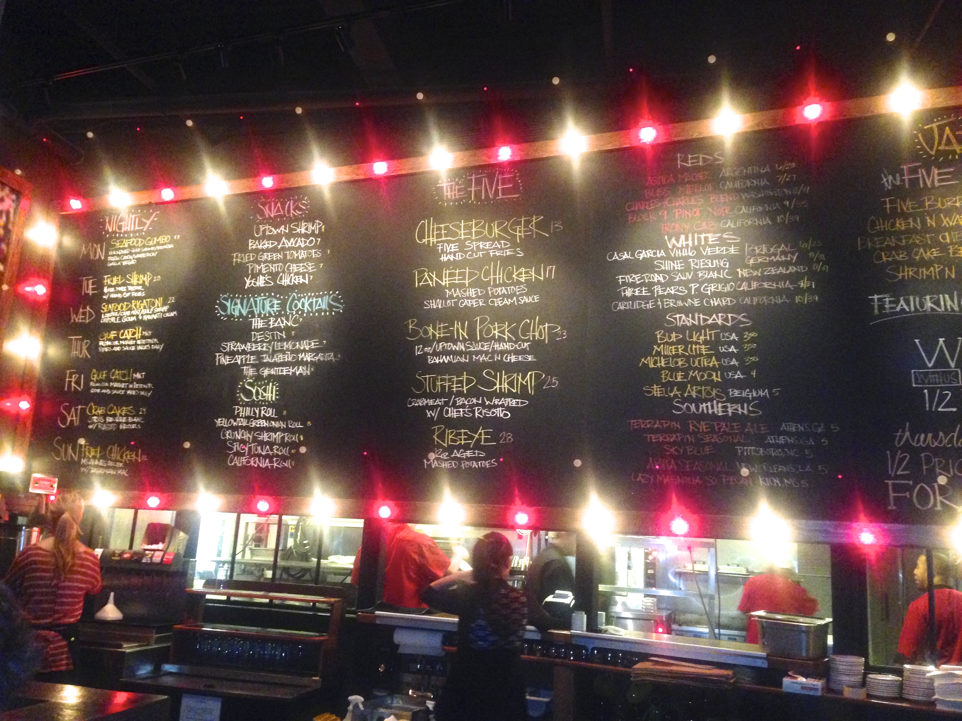 The menu is posted on the wall and changes all of the time. There are five of each category available every day. Five appetizers, five signature cocktails, five sushi rolls, five entrees–you get the picture. There are five red wines, five white wines, five crappy beers and five craft beers. The prices here are a bit higher than many places in town, which means you get a grown-up crowd. The students don’t hang out here unless their parents are in town.